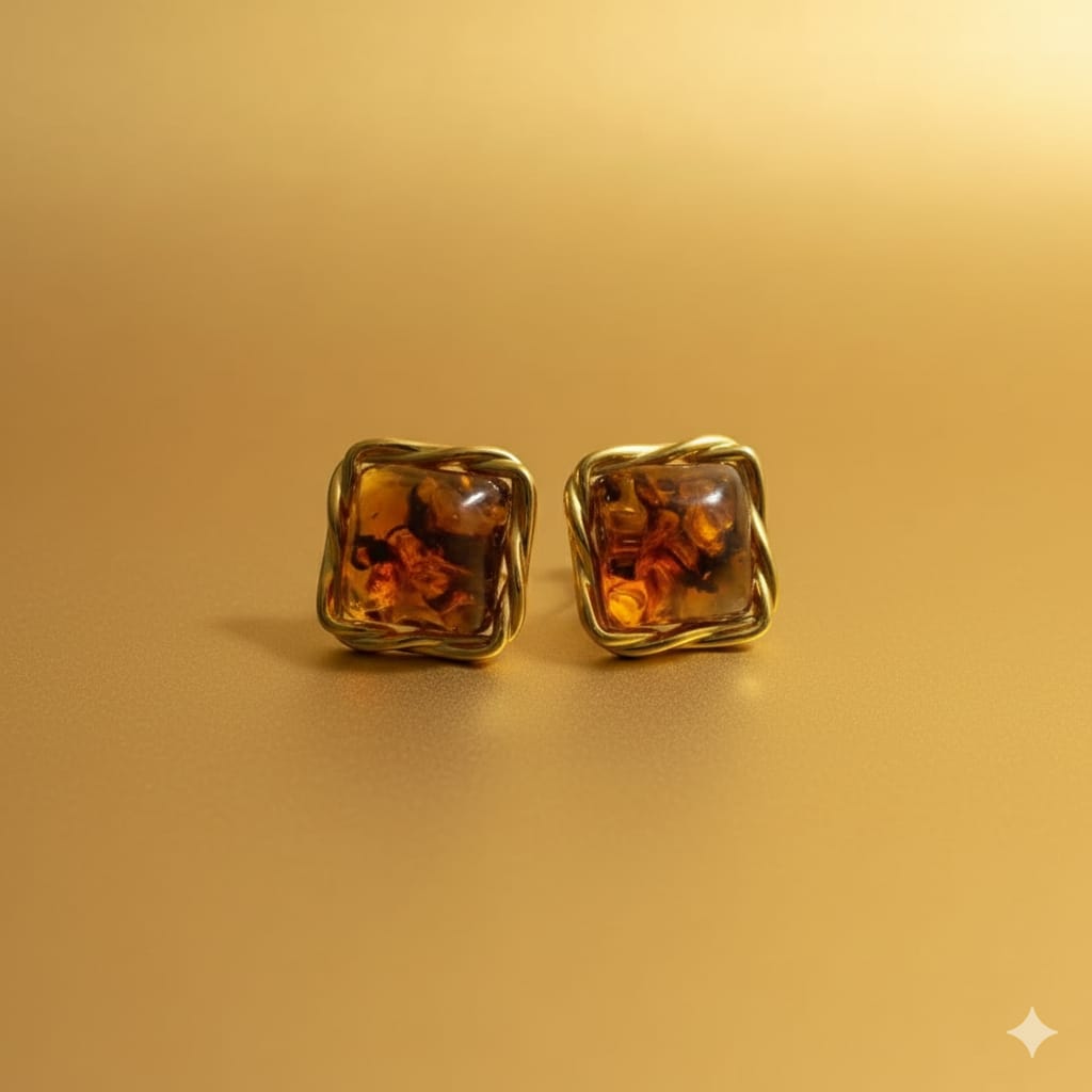 These square stud earrings showcase a warm, rich amber stone encased in a twisted gold-toned wire frame, giving them a rustic yet refined appeal.