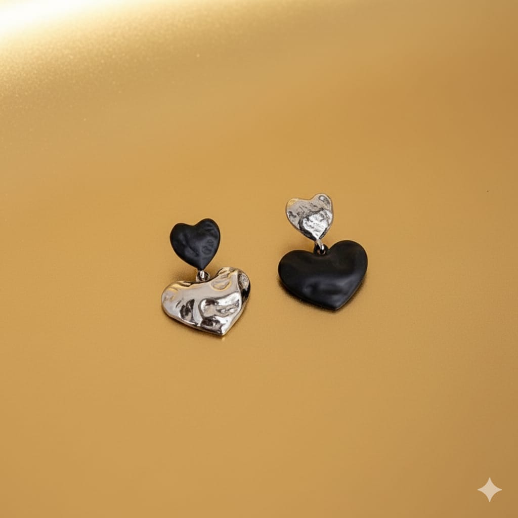 A playful and modern pair of drop earrings, featuring contrasting heart shapes in black and textured silver, creating an eye-catching asymmetrical design