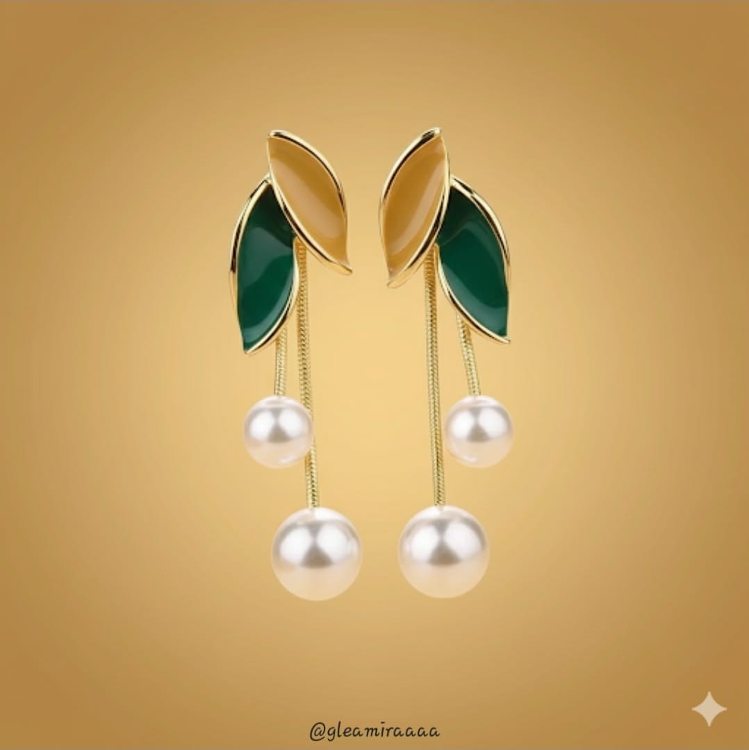 “Charming earrings featuring a pair of vibrant enamel leaves—one rich golden yellow, one deep forest green—from which delicate golden chains suspend two lustrous white pearls each. A playful yet elegant accessory for any occasion.”