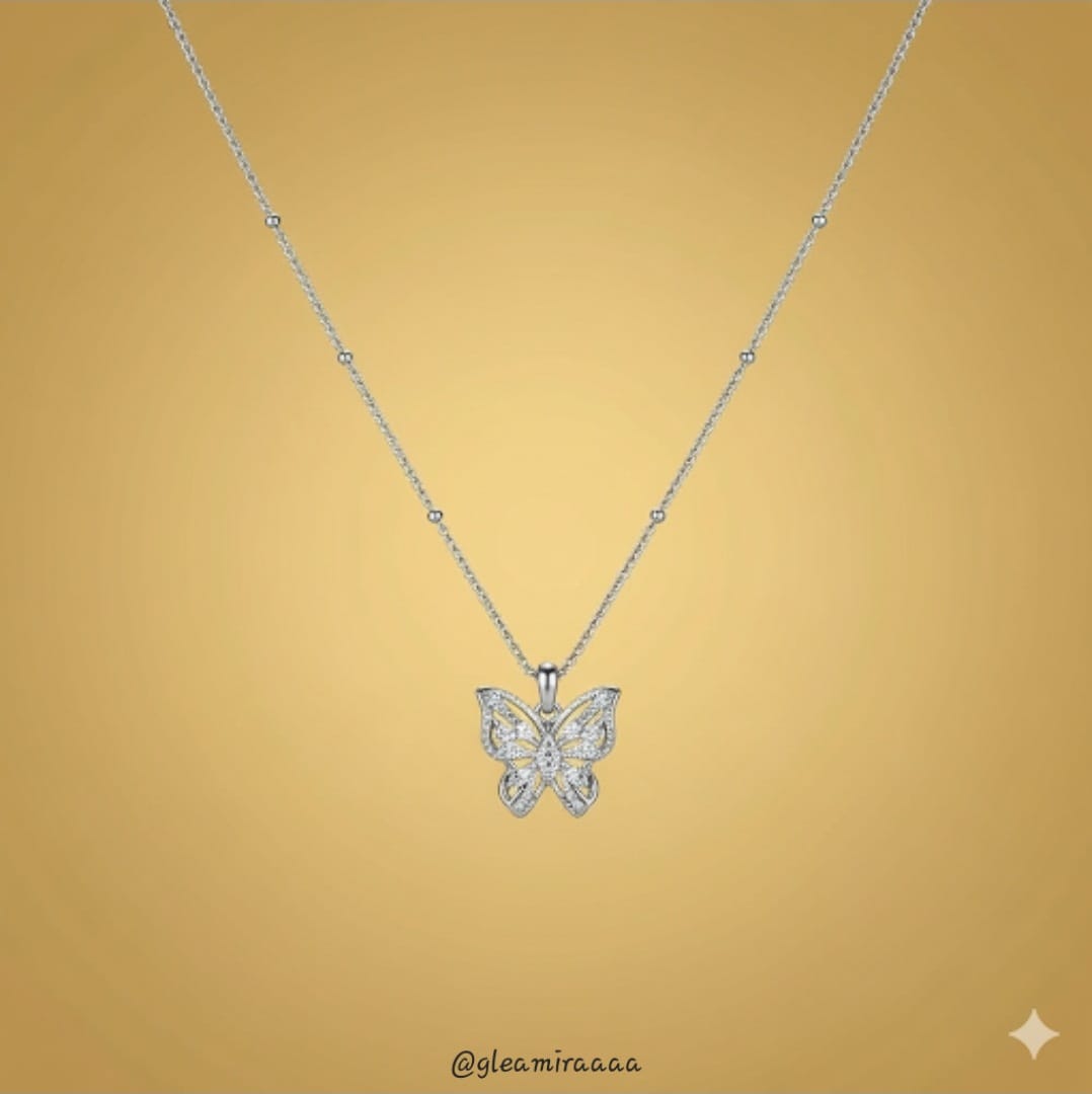 Elevate your everyday with our Beaded Chain Sparkle Butterfly Necklace. This charming silver-tone piece features a delicate chain accented with small polished beads, leading to a beautifully intricate butterfly pendant completely adorned with shimmering rhinestones. A radiant and elegant accessory that adds a touch of whimsical sparkle to any outfit.