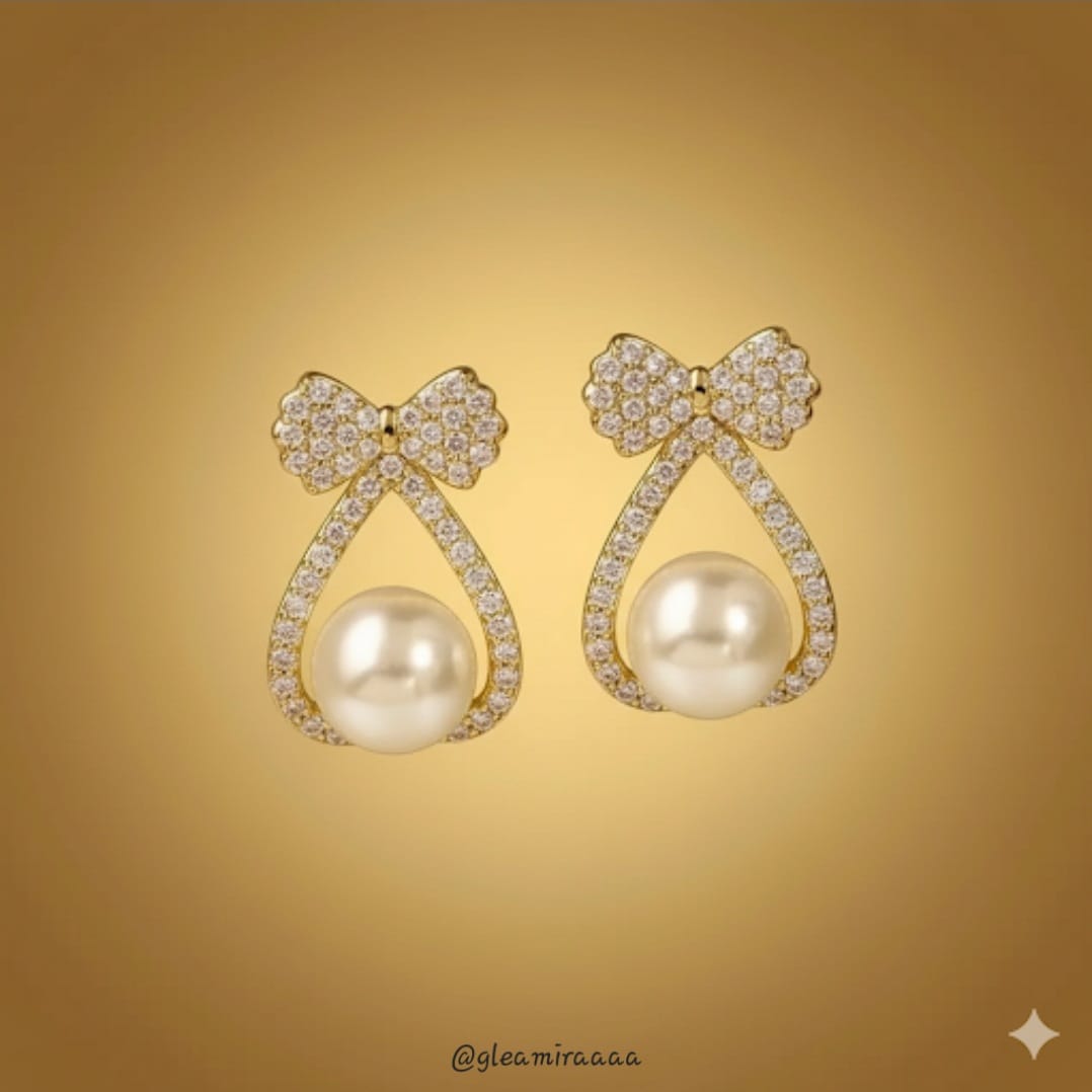 “Charming earrings showcasing a delicate, pavé-set crystal bow atop a sparkling teardrop frame, cradling a luminous cream-colored pearl. A sweet and sophisticated accessory for any occasion.”