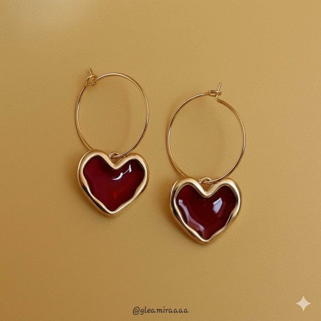 These charming hoop earrings feature a vibrant and playful design. Each golden-toned hoop suspends a beautifully crafted heart-shaped charm, filled with a rich, glossy crimson red enamel. The heart is framed by a sleek golden border, making these earrings a sweet and stylish accessory to express a little love.