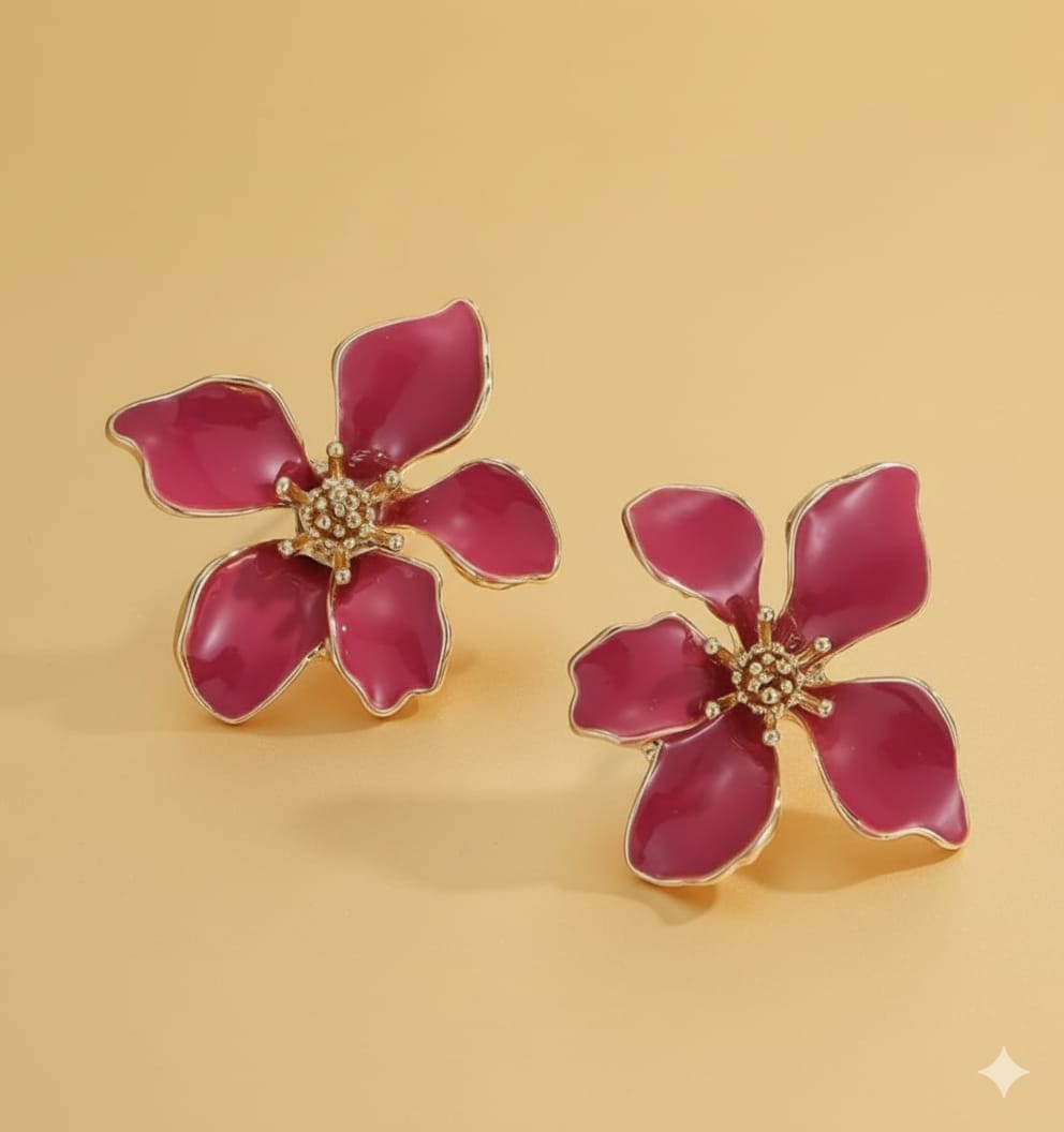 These vibrant stud earrings feature a five-petal flower design in a rich, deep crimson red. A detailed cluster of golden and crystal accents forms the center, adding a touch of brilliance to the bold color.