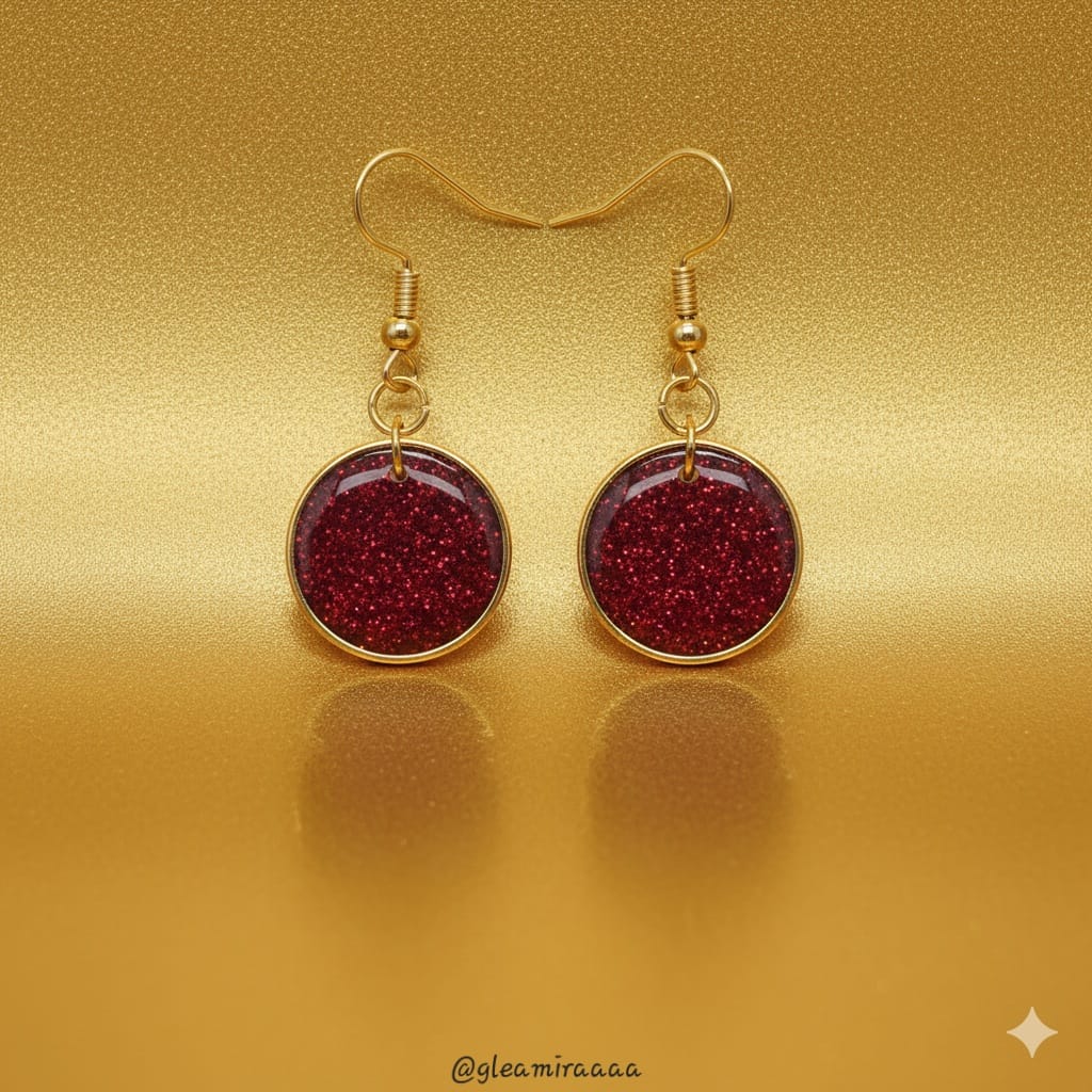 Ignite your look with the fiery brilliance of these Crimson Sparkle Druzy Dangle Earrings! Each circular earring features a rich, deep red surface shimmering with a textured, glitter-like finish, reminiscent of opulent natural druzy. Encased in an elegant gold-tone frame and featuring lightweight hooks, these earrings are designed to add a touch of dramatic sparkle and sophisticated glamour to any outfit, perfect for making a statement.