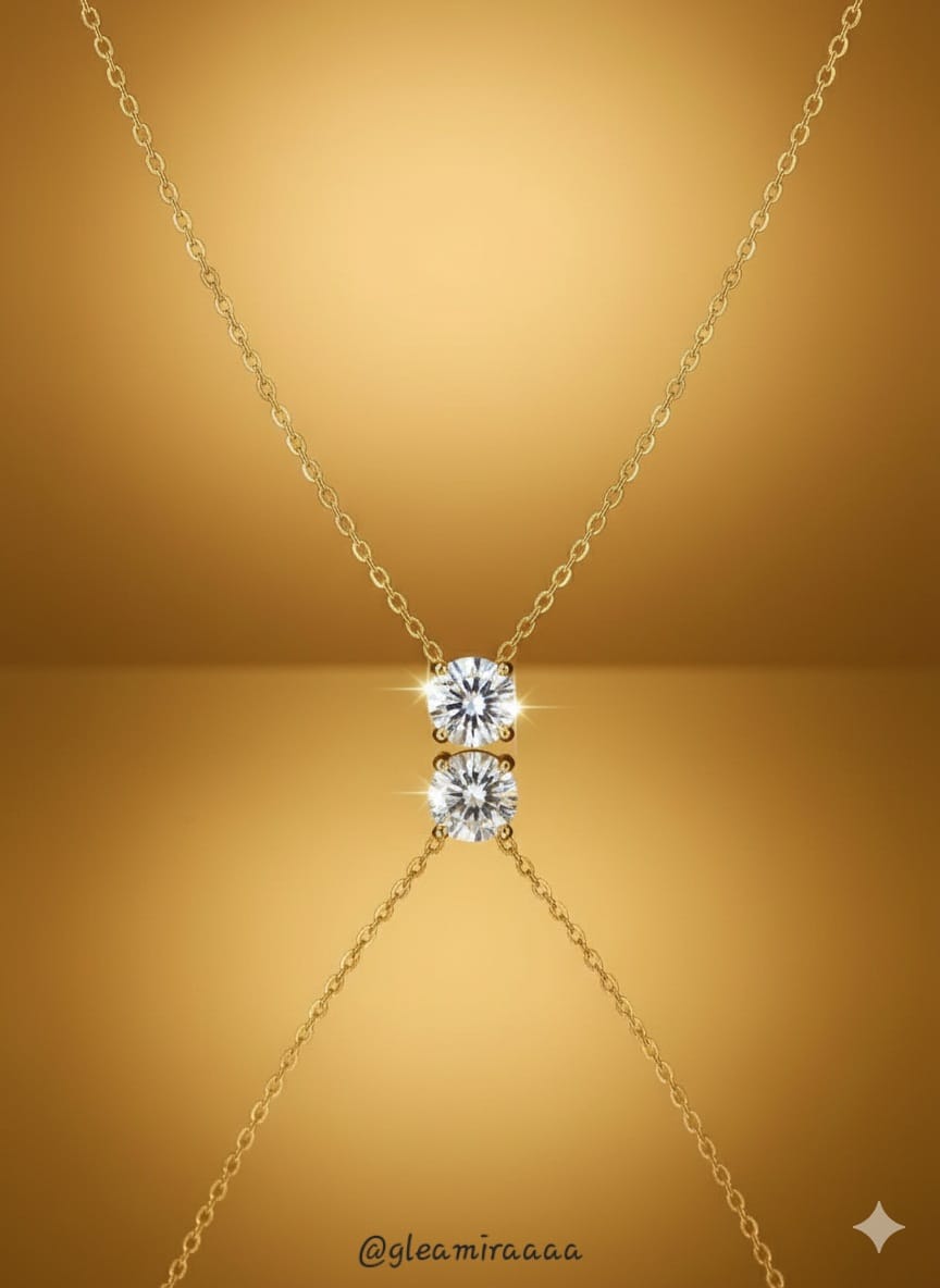 Illuminate your décolletage with the Gleamira Dazzling Dual Solitaire Gold Necklace. This exquisite piece features two brilliant, round-cut solitaire gemstones, meticulously faceted to capture and reflect light with exceptional sparkle. Each gem is elegantly set on a delicate gold-tone chain, designed to create a captivating and luxurious statement. The twin solitaires offer a sophisticated shimmer, perfect for adding glamour to an evening ensemble or a touch of refined brilliance to your everyday look. This necklace is an ideal gift for celebrating milestones, expressing love, or simply indulging in timeless elegance and radiant beauty.