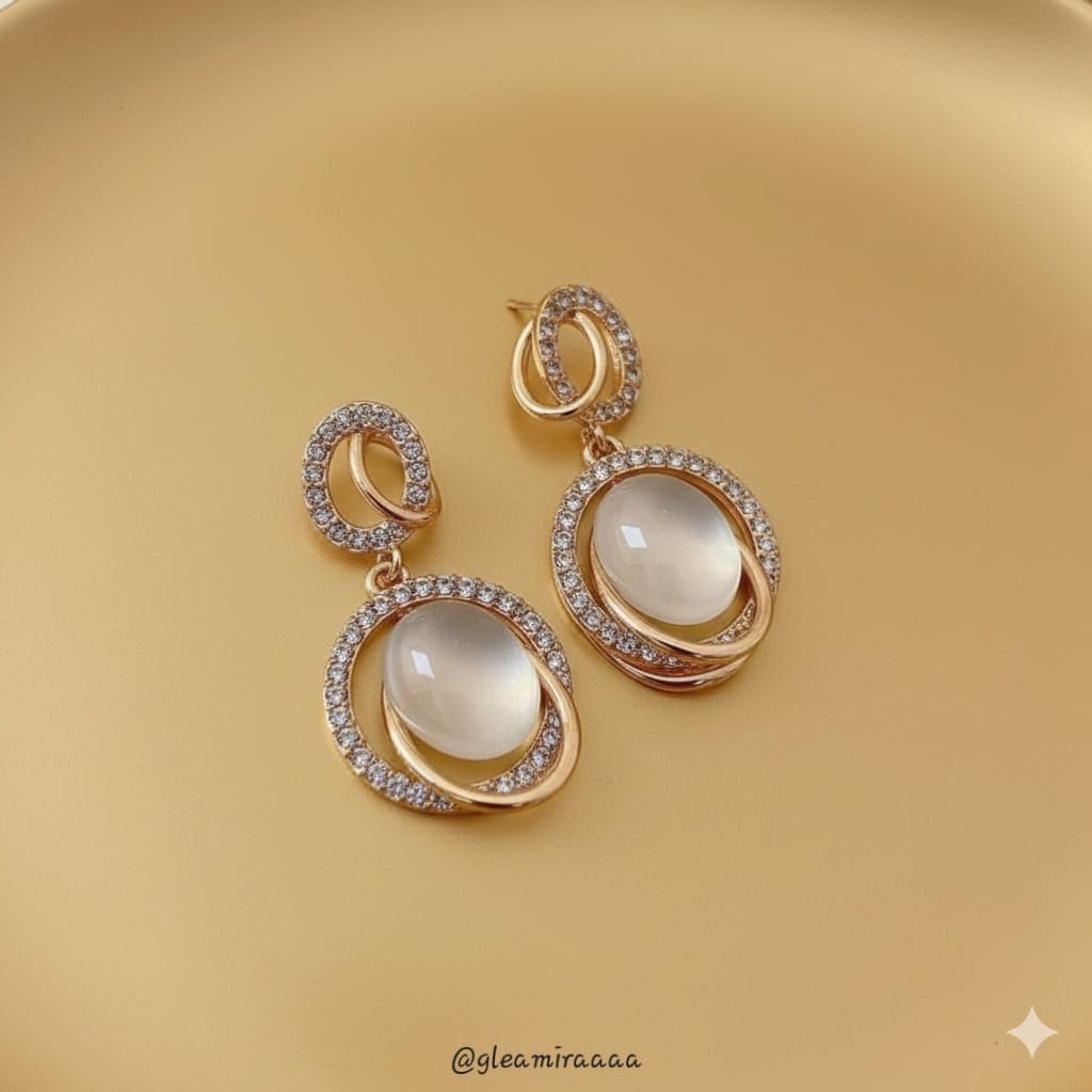 These elegant drop earrings feature a radiant oval-shaped center stone, possibly a moonstone or opal, encased within a double halo of sparkling pavé-set crystals. The design is completed with a delicate, crystal-embellished ear hook, all set in a warm, gold-toned metal. Perfect for adding a touch of sophisticated shimmer to any outfit.