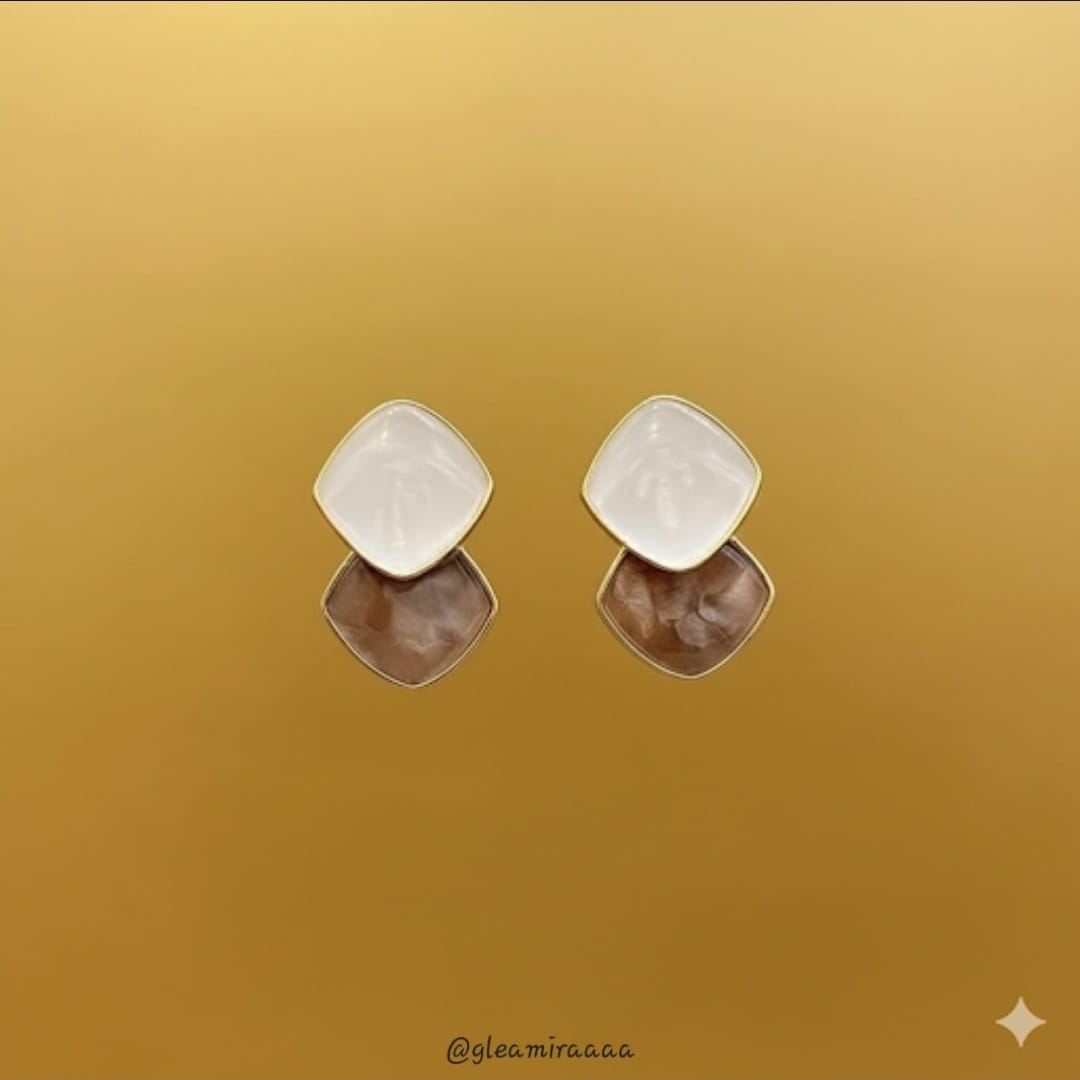 These modern drop earrings feature a stylish combination of two square-shaped segments with gently rounded corners. The top segment is a creamy white, while the bottom boasts a rich, marbled brown hue. This contrasting two-tone design offers a contemporary and sophisticated look, perfect for adding a subtle pop of color and shape to any ensemble.