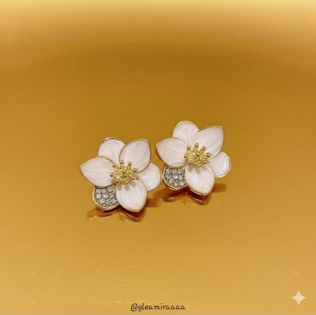 These exquisite stud earrings feature a delicate five-petal flower design with creamy white enamel petals outlined in gold. Each flower’s center is adorned with a cluster of golden stamen-like details, and a lower petal is beautifully embellished with sparkling pavé-set crystals, adding a touch of sophisticated glamour to this graceful floral accessory.