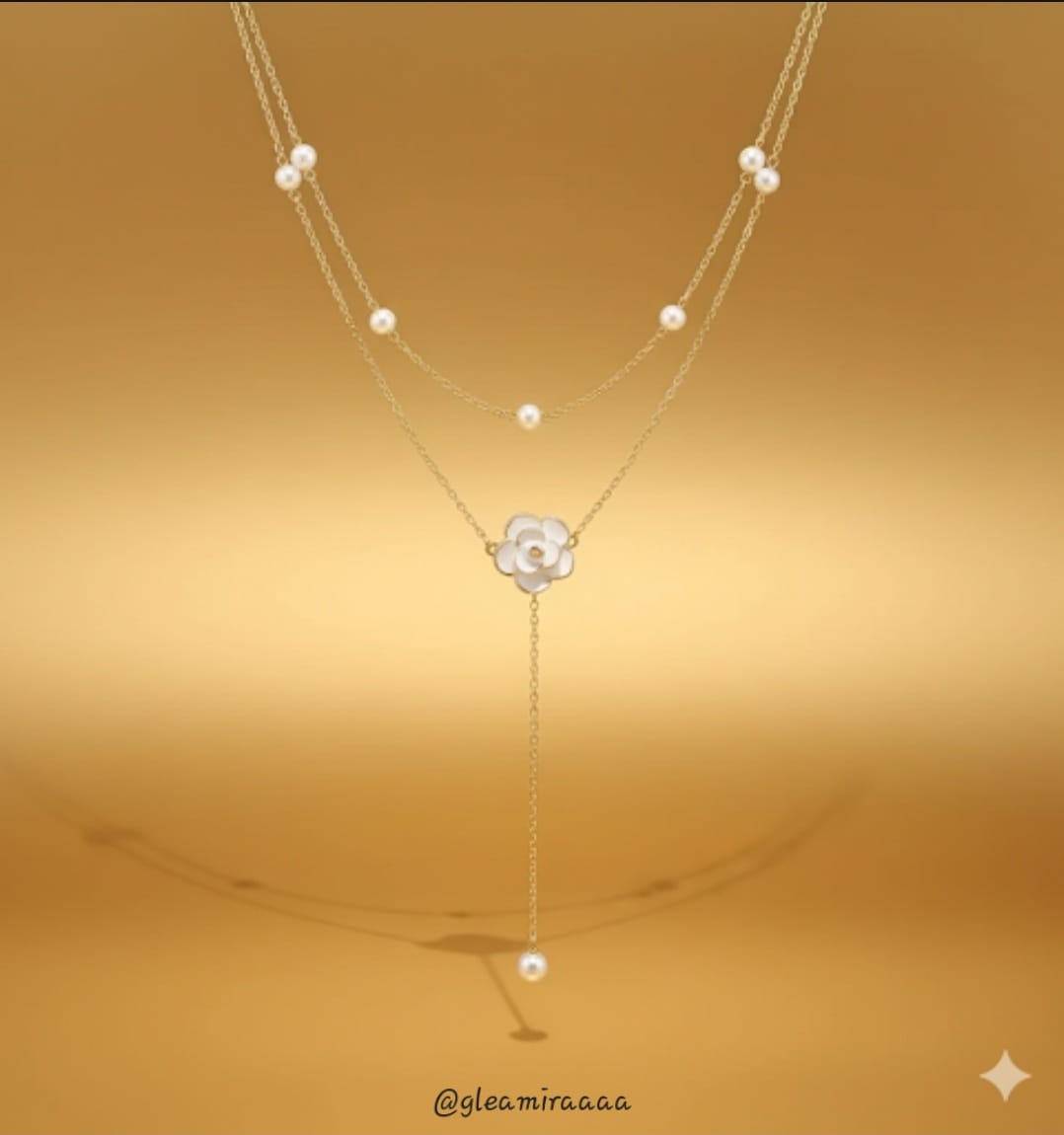 Exude timeless grace with our Elegant Camellia & Pearl Cascade Necklace. This beautiful gold-tone piece features a delicate double-strand design adorned with lustrous faux pearls. A charming white camellia flower takes center stage, from which a graceful drop extends, culminating in another exquisite pearl. Perfect for adding a touch of sophisticated charm to any ensemble.