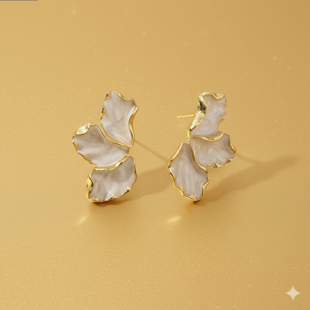 They are delicate, gold-toned earrings with a unique, textured petal design in a soft, light shade, perfect for adding a touch of sophisticated charm to any outfit.