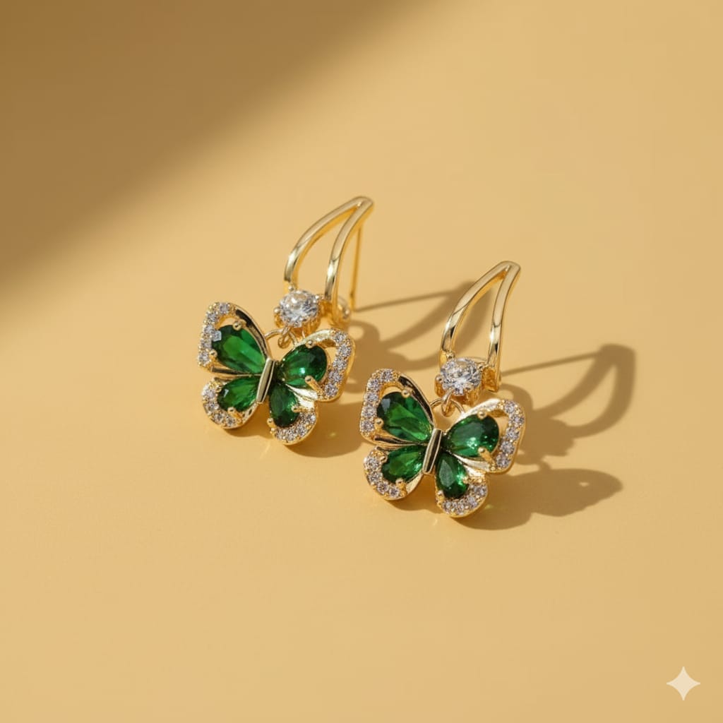 Enchanting drop earrings shaped like delicate butterflies, with wings intricately set with vibrant emerald green gems and sparkling clear crystals.
