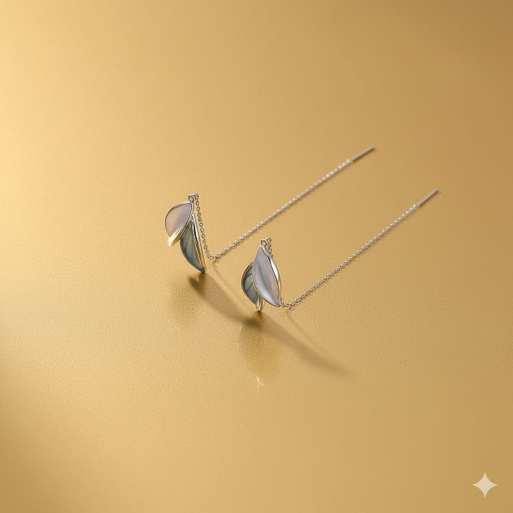 These elegant threader earrings feature delicate silver chains that pass through the ear, culminating in a beautiful, sculpted leaf-like design with subtle grey and white iridescent tones. They offer a modern, understated, and nature-inspired aesthetic.