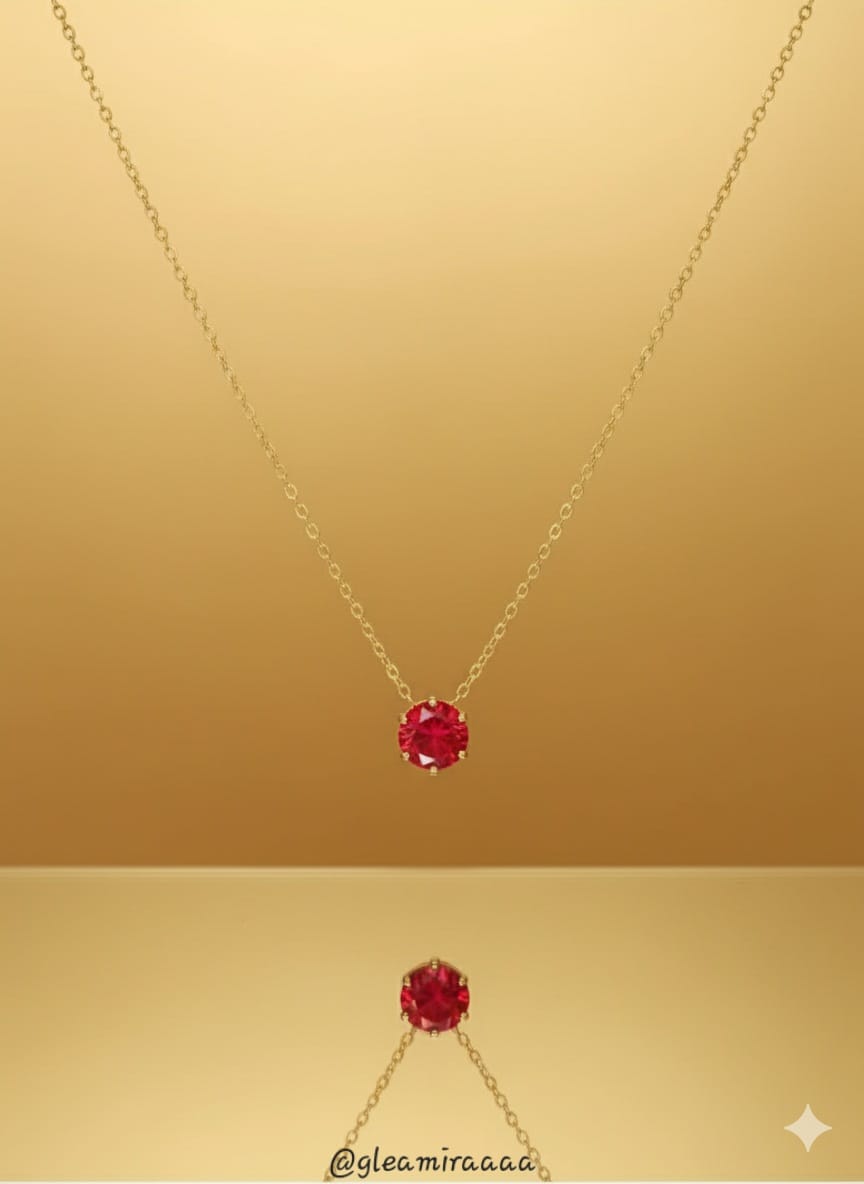 Make a bold and beautiful statement with our Gleamira Fiery Red Solitaire Gemstone Necklace. This captivating piece showcases a brilliant, round-cut gemstone in an intense ruby-red hue, expertly faceted to catch every glint of light. Set on a delicate gold-tone chain, the vibrant red gem offers a striking contrast against the warm gold, symbolizing passion and strength. Perfect for adding a touch of drama to an evening look or a pop of luxurious color to your everyday style, this necklace is designed to turn heads. It’s a magnificent gift for those who adore classic elegance with a fiery spirit.