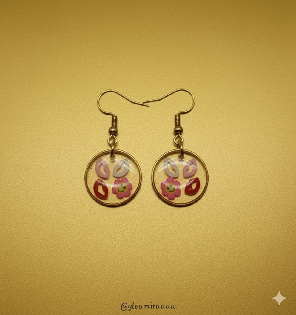 Pucker up for playful style with these charming Flirty Blooms & Kisses Dangle Earrings! Each clear resin circle playfully encases miniature elements including a sweet smiling pink flower, a vibrant red kissy lip, and delicate pastel shapes. Framed in a subtle gold-tone and featuring lightweight hooks, these unique earrings are a whimsical and quirky accessory designed to add a touch of fun and personality to any outfit.