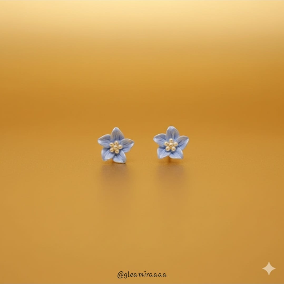 “Delicate stud earrings shaped like charming pale blue five-petal flowers, each adorned with a cluster of tiny golden beads at its center. A subtle and sweet accessory.”