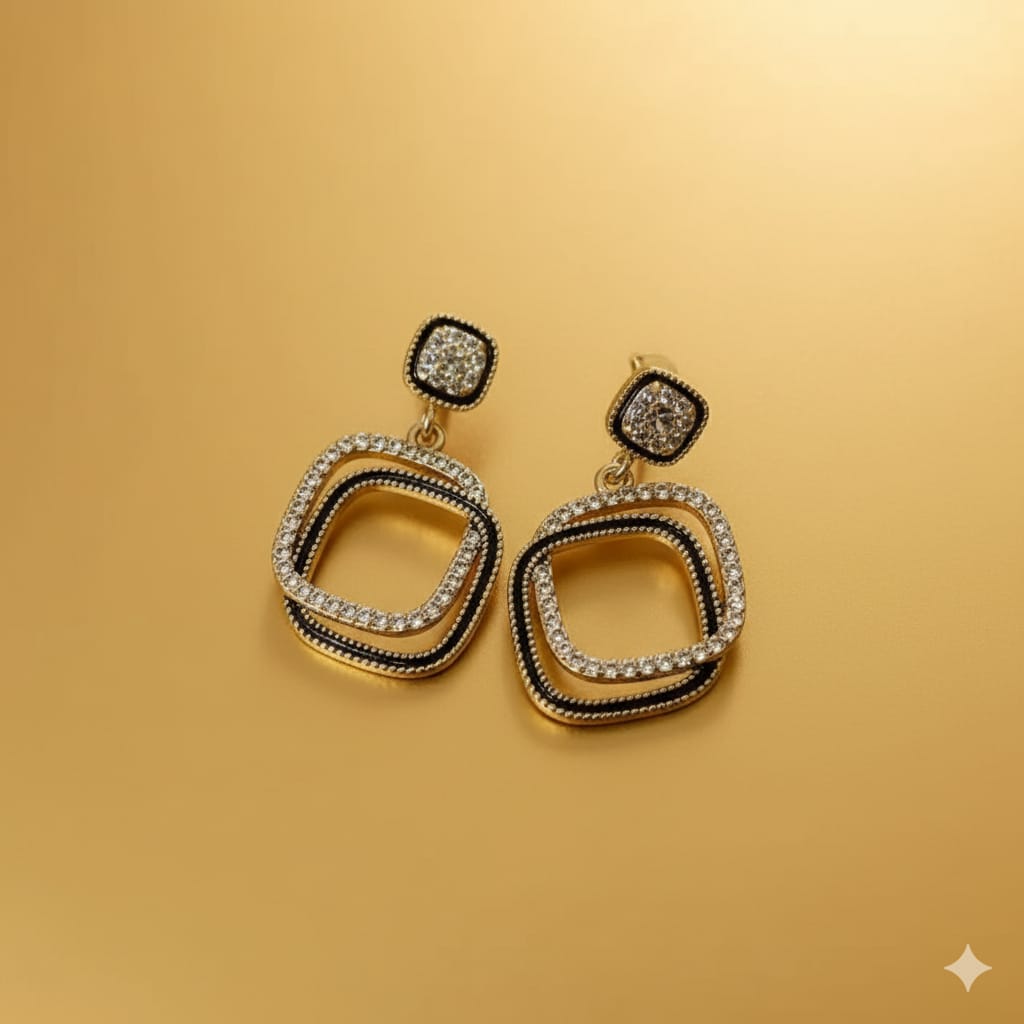 These contemporary dangle earrings feature two interlocking square frames, one sleek black and the other adorned with dazzling pavé-set crystals. They hang from a crystal-studded stud, offering a chic and modern look with striking contrast.