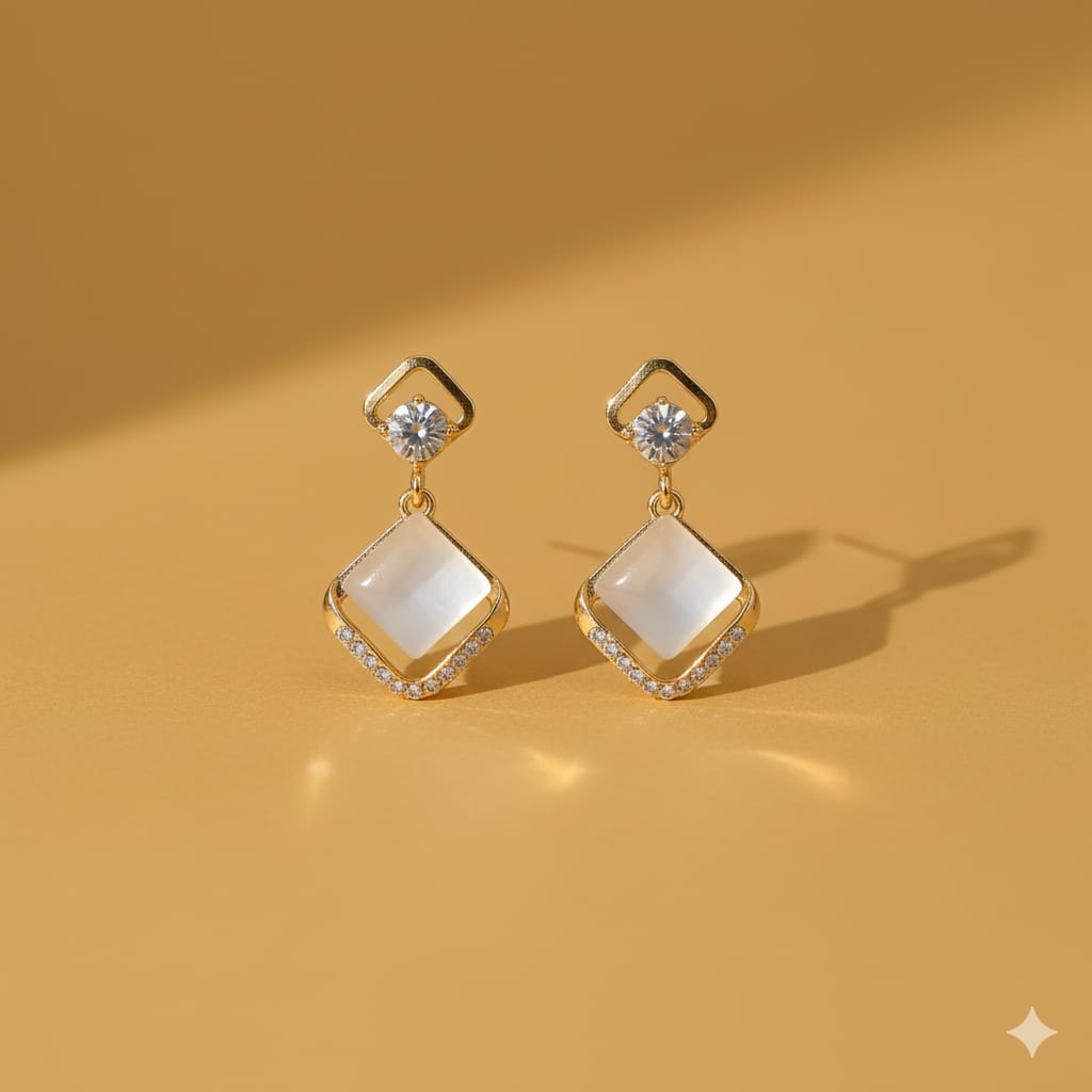 Elegant drop earrings with a sparkling crystal stud atop a gold-framed square white pearl, combining geometric design with classic sophistication.