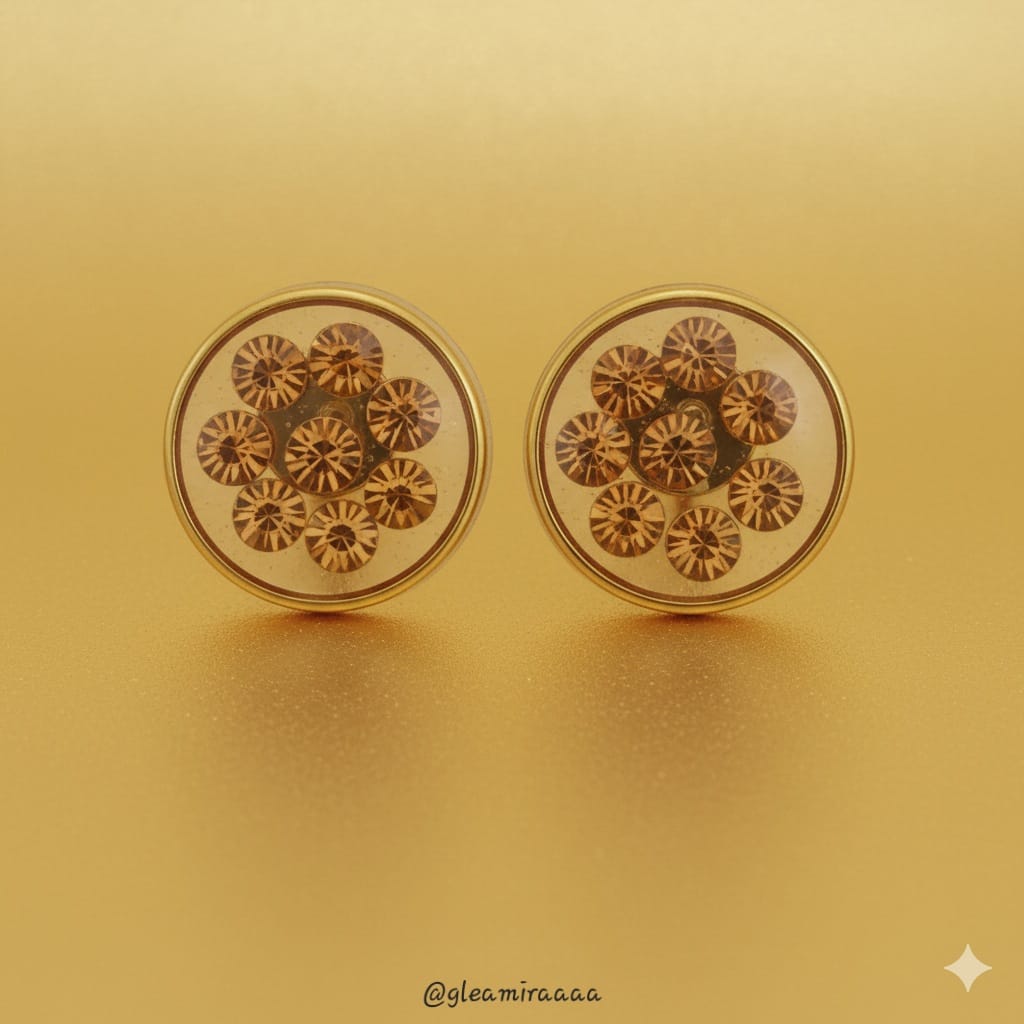Elevate your look with these dazzling stud earrings, featuring a captivating cluster of amber-hued crystals meticulously arranged and set within a clear, high-gloss resin dome. Encased in a radiant gold-toned bezel, these earrings catch the light beautifully, offering a sophisticated sparkle that’s perfect for both everyday wear and special occasions. Their timeless design adds a touch of warm elegance and glamour to any ensemble.