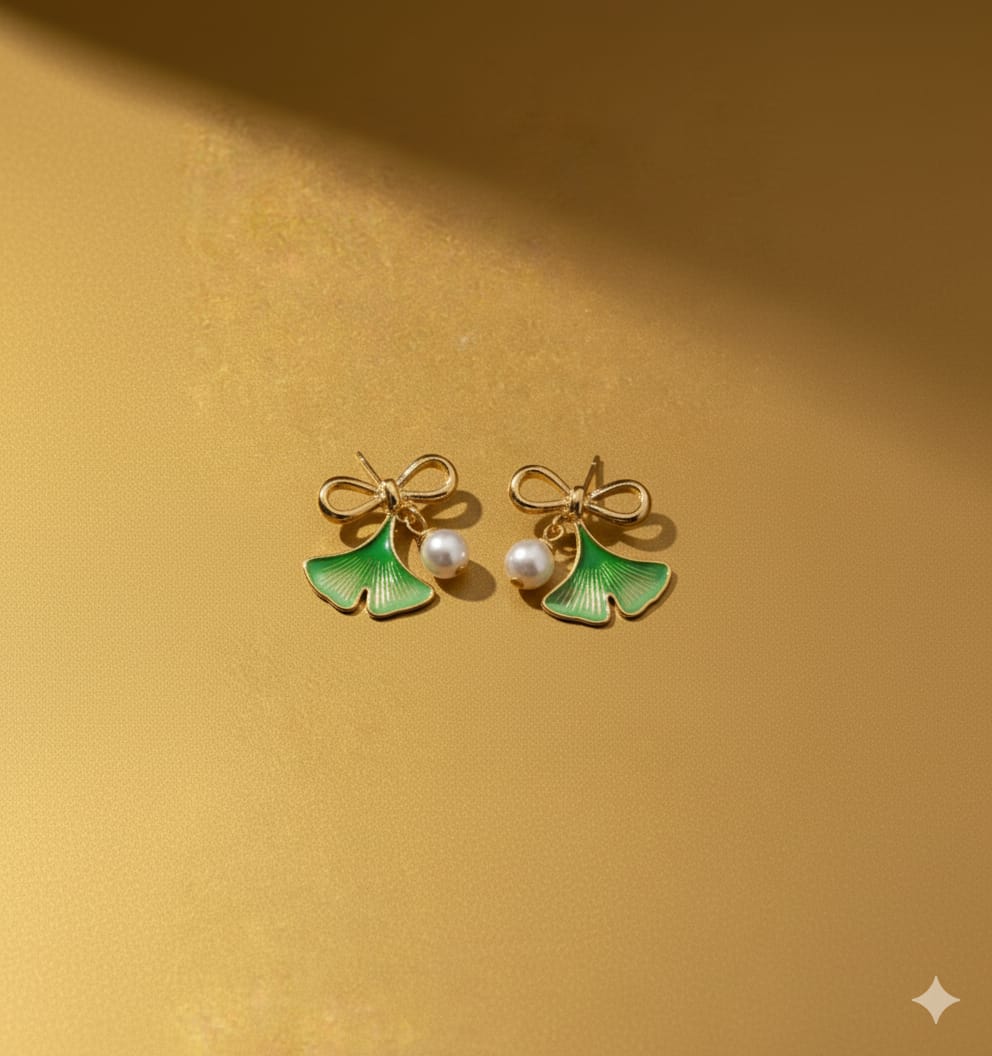 Stylish gold-toned earrings with a charming bow, a vibrant green enamel ginkgo leaf, and a lustrous pearl drop, perfect for adding a touch of nature-inspired color.
