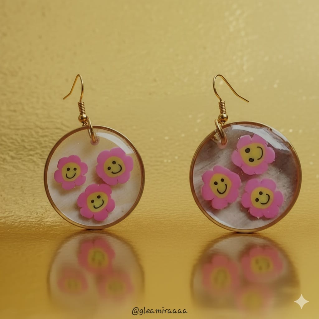 “Spread smiles wherever you go with our delightful Happy Blossom Circle Drop Earrings! These whimsical earrings feature an adorable cluster of pink smiley-face flowers suspended in clear resin, set against a subtle shimmery background and framed in elegant gold. Lightweight and brimming with positive vibes, they’re the perfect accessory to brighten your day and add a playful touch to any outfit.”