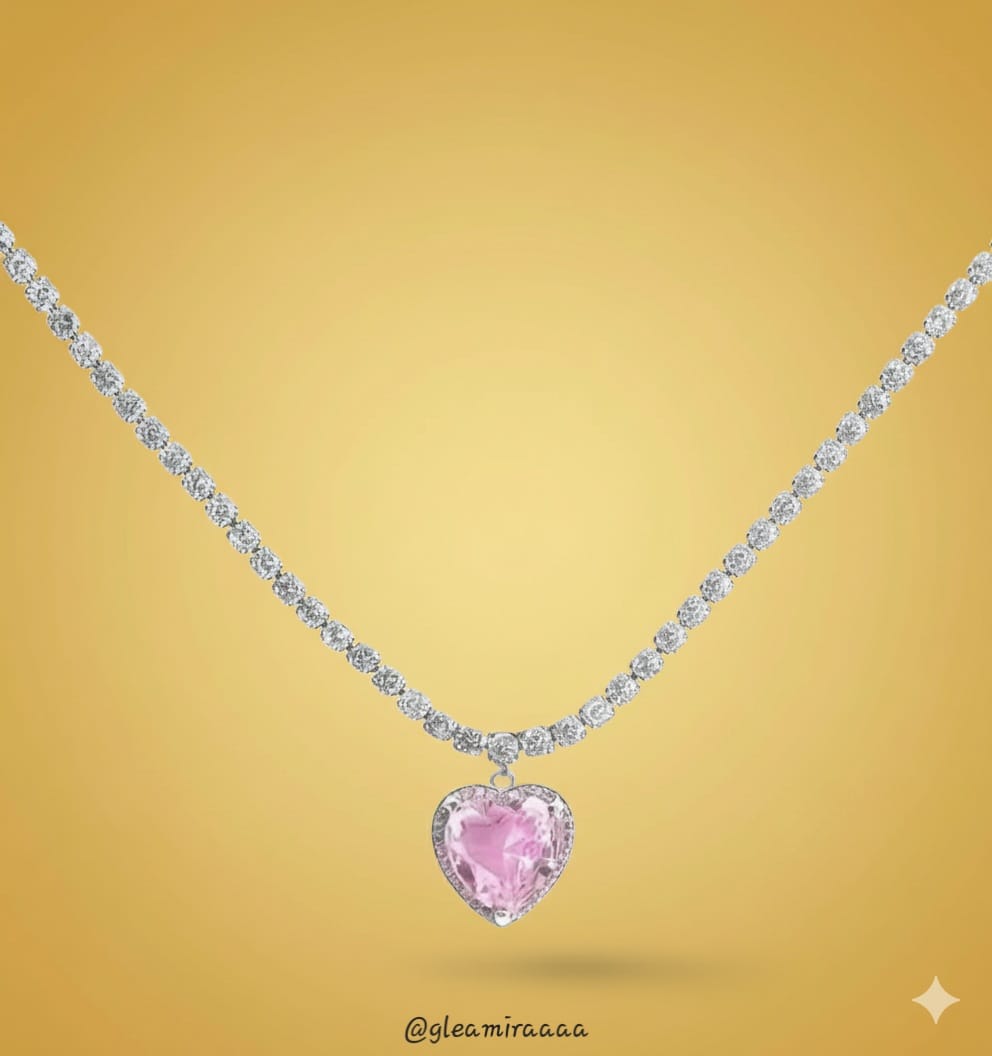 Make a breathtaking statement with our “Heart of the Ocean” Pink Diamond Necklace. This luxurious piece features a continuous chain of brilliant, individually set rhinestones leading to a magnificent, faceted heart-shaped pendant in a captivating shade of pink. An absolutely stunning accessory designed to dazzle and impress.