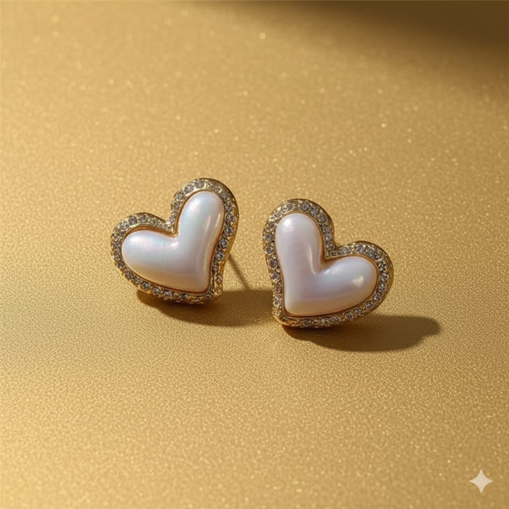 Exquisite heart-shaped stud earrings featuring a luminous pearl at their center, encircled by a dazzling halo of small, brilliant diamonds
