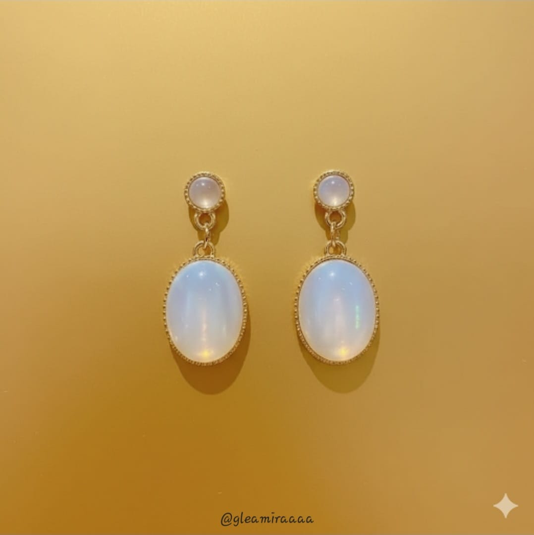 Graceful drop earrings featuring a shimmering oval opalite stone suspended beneath a smaller round opalite accent. Delicately framed for an ethereal glow.