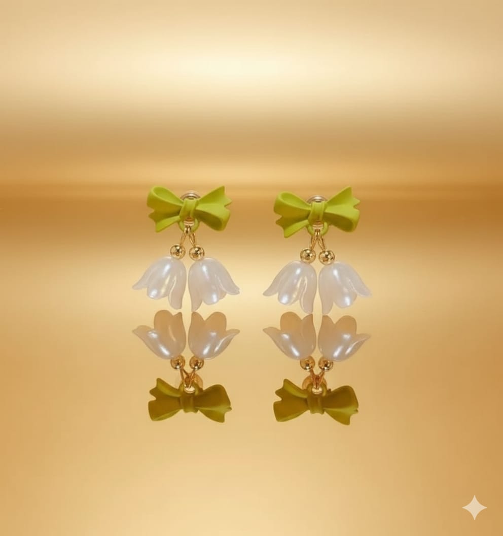 Whimsical drop earrings featuring a bright lime green bow stud, from which dangle two white, bell-shaped lily or flower pendants accented with small gold beads.