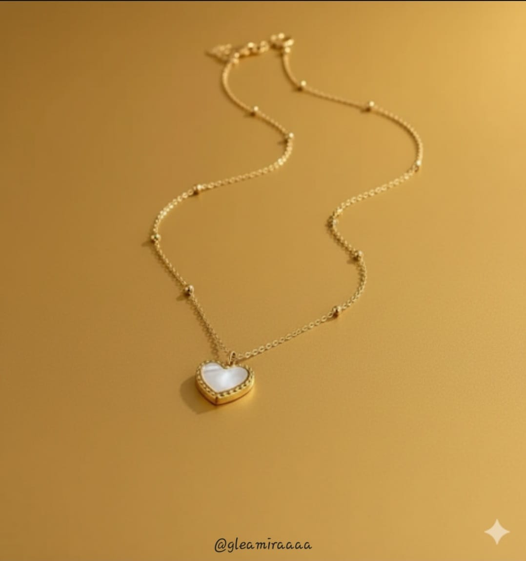 Adorn yourself with the subtle glow of our Luminous Mother-of-Pearl Heart Necklace. This delicate gold-tone chain is embellished with small polished beads and features a captivating heart-shaped pendant, exquisitely crafted with iridescent mother-of-pearl. A timeless and elegant piece that offers a gentle radiance and a touch of romantic charm.