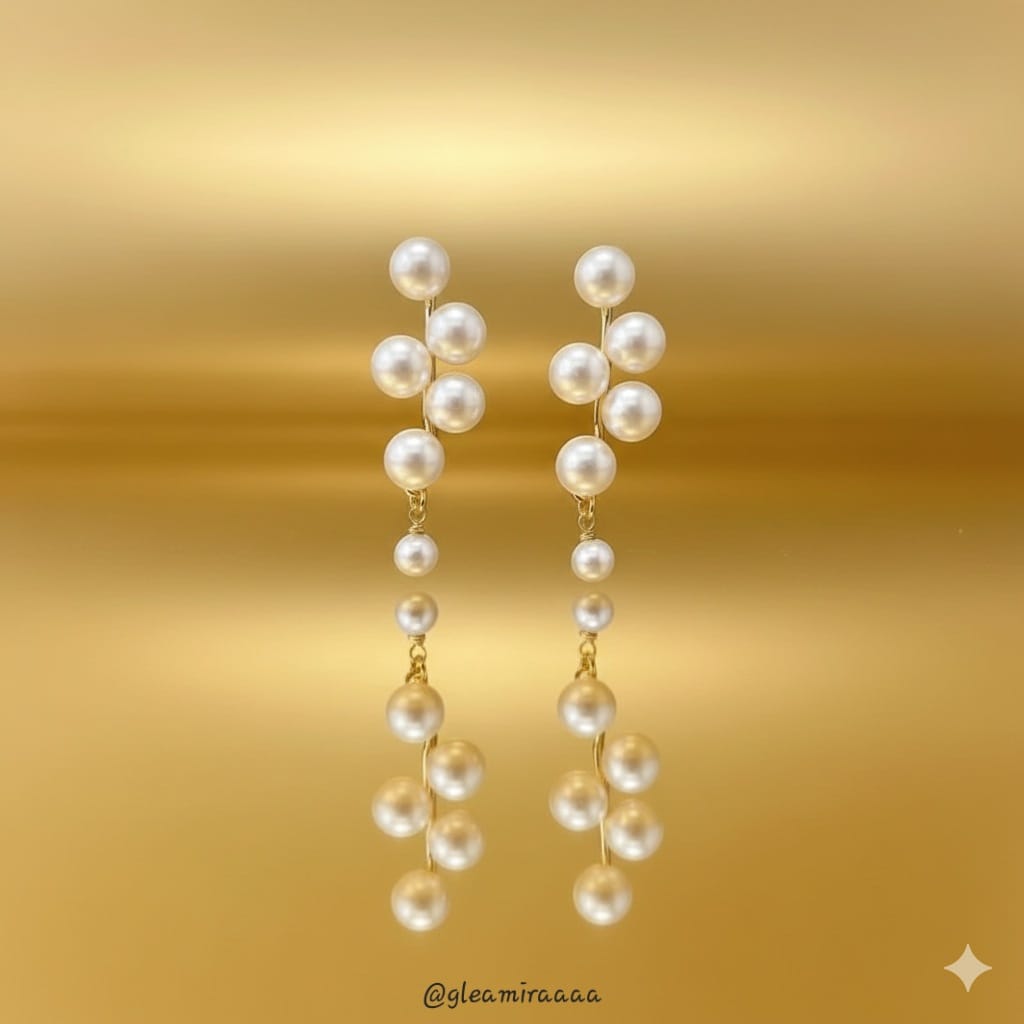 These elegant drop earrings feature a delicate, cascading design reminiscent of a pearl-laden vine. Lustrous faux pearls of varying sizes are meticulously arranged along golden-toned settings, creating a graceful and flowing silhouette. These earrings offer timeless sophistication with a unique, organic-inspired charm, perfect for adding a touch of classic elegance.