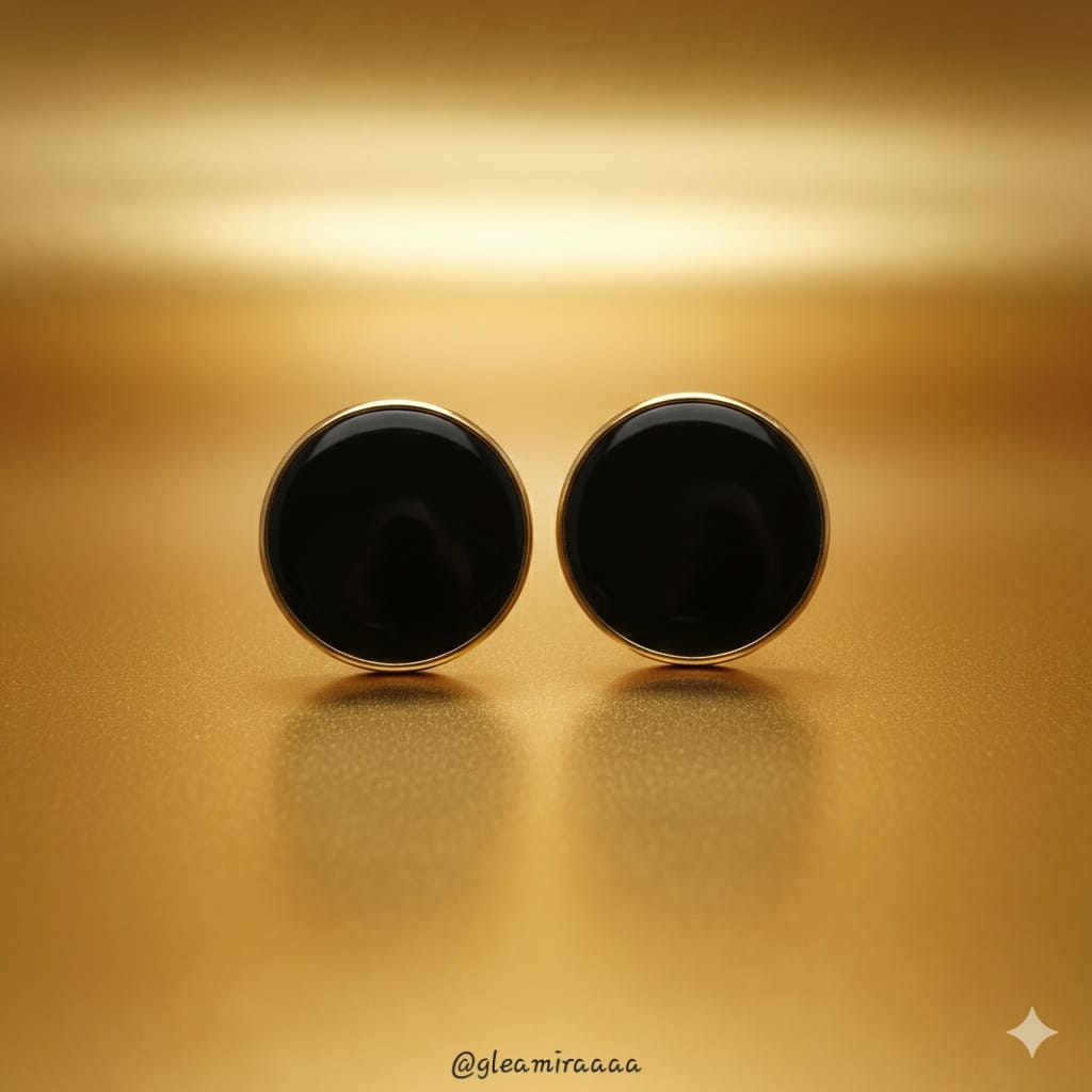 Embrace timeless sophistication with these sleek and elegant stud earrings. Each piece features a lustrous, opaque jet-black resin dome, mirroring the deep, polished sheen of black onyx. Expertly set within a radiant gold-toned bezel, these minimalist earrings offer a striking contrast and versatile appeal. Perfect for adding a touch of classic chic and understated drama to both casual and formal attire.