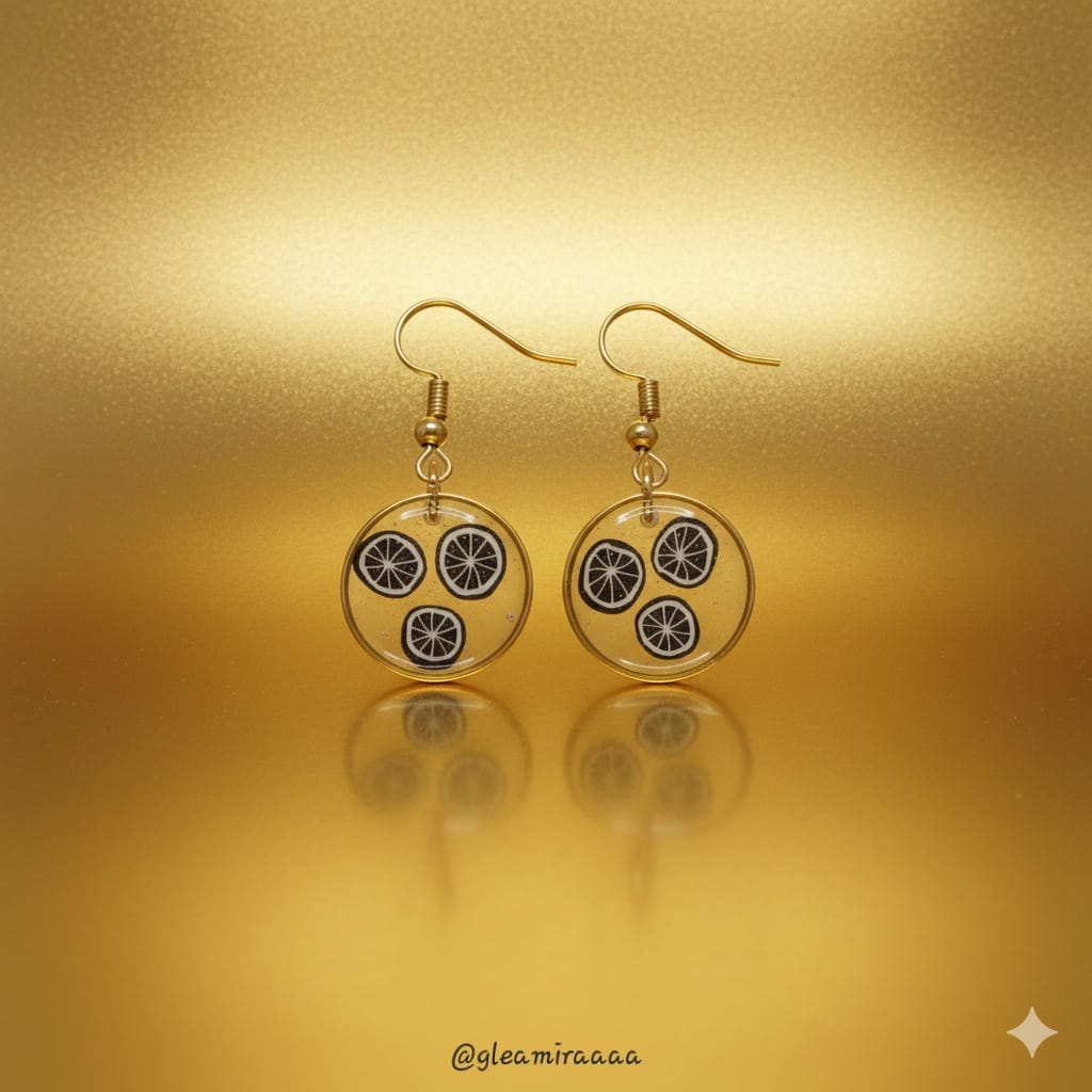 “Roll into sophisticated style with our Monochrome Wheel Resin Drop Earrings. These chic circular earrings feature an intriguing geometric pattern of black and white ‘wheel’ designs suspended in crystal-clear resin, framed in a sleek gold bezel. A modern and minimalist accessory that adds an edgy yet refined touch to any ensemble.”