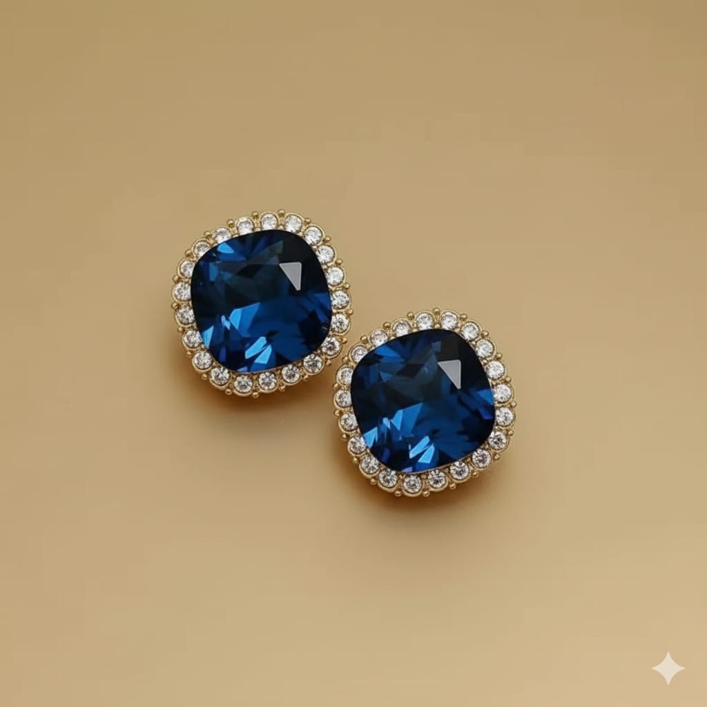Stunning cushion-cut blue gemstone studs, encircled by a halo of sparkling clear diamonds, evoking the depth and brilliance of the ocean.