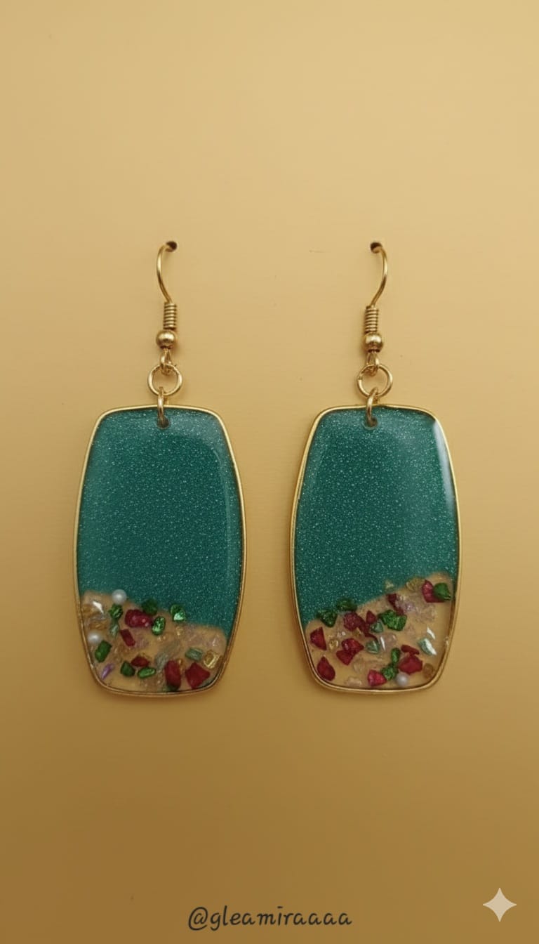 Dive into dazzling elegance with our Ocean Shimmer Resin Drop Earrings. Featuring a captivating teal glitter top and a clear base filled with sparkling gold flakes and ruby red accents, these earrings evoke the beauty of hidden treasures beneath the waves. Lightweight and eye-catching, they’re perfect for adding a touch of sophisticated sparkle to any outfit.”