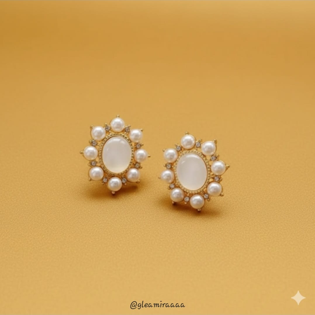 Exquisite oval stud earrings featuring a luminous white or opalescent cabochon center, encircled by a radiant halo of small pearls and tiny sparkling crystals. A sophisticated and timeless design.”