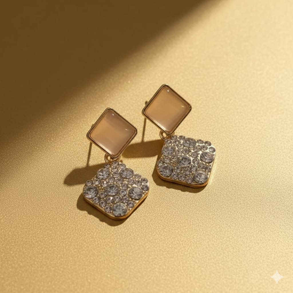 Stylish drop earrings featuring a plain square stud at the top, connected to a larger square adorned with a multitude of pave-set brilliant crystals.