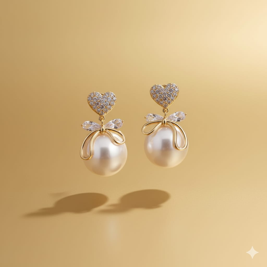 Romantic drop earrings featuring a pave-set crystal heart stud, a small crystal-embellished bow, and a large, lustrous white pearl suspended by a delicate gold curve.