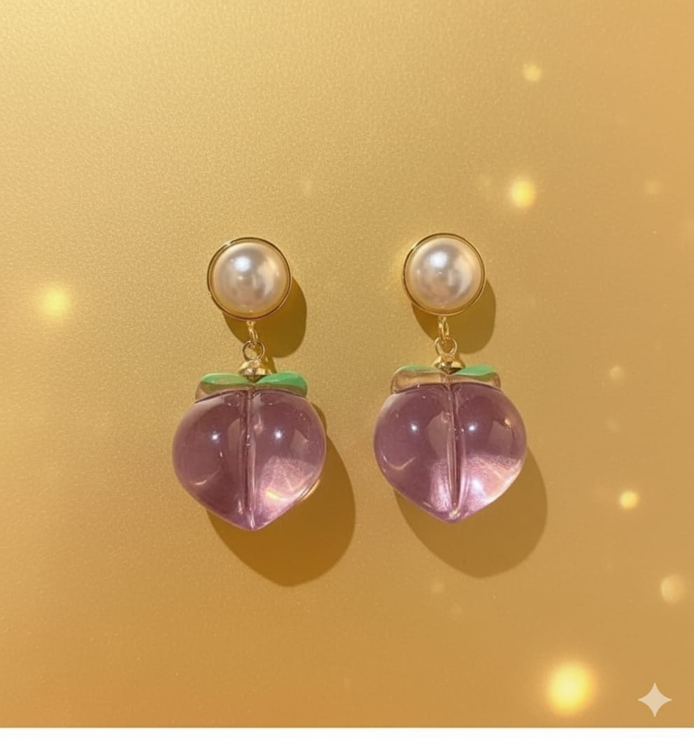 Playful drop earrings featuring a lustrous pearl stud from which a faceted, translucent amethyst-colored peach charm with a subtle green leaf accent dangles, adding a touch of whimsical elegance.