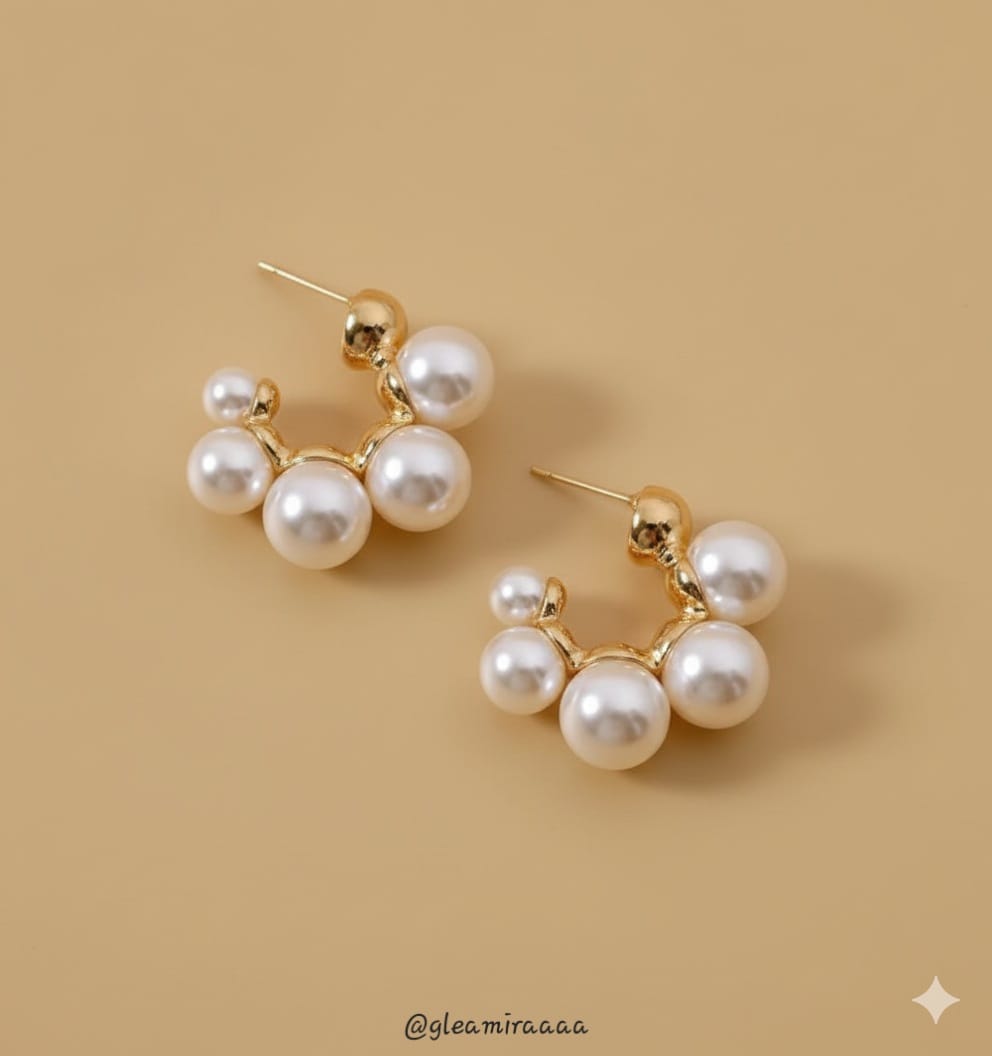 These elegant earrings feature a chic half-hoop design, beautifully adorned with a cluster of lustrous faux pearls of varying sizes. The pearls are arranged on a golden-toned setting, creating a sophisticated and full-bodied look that offers the classic appeal of pearls with a modern, structured silhouette.
