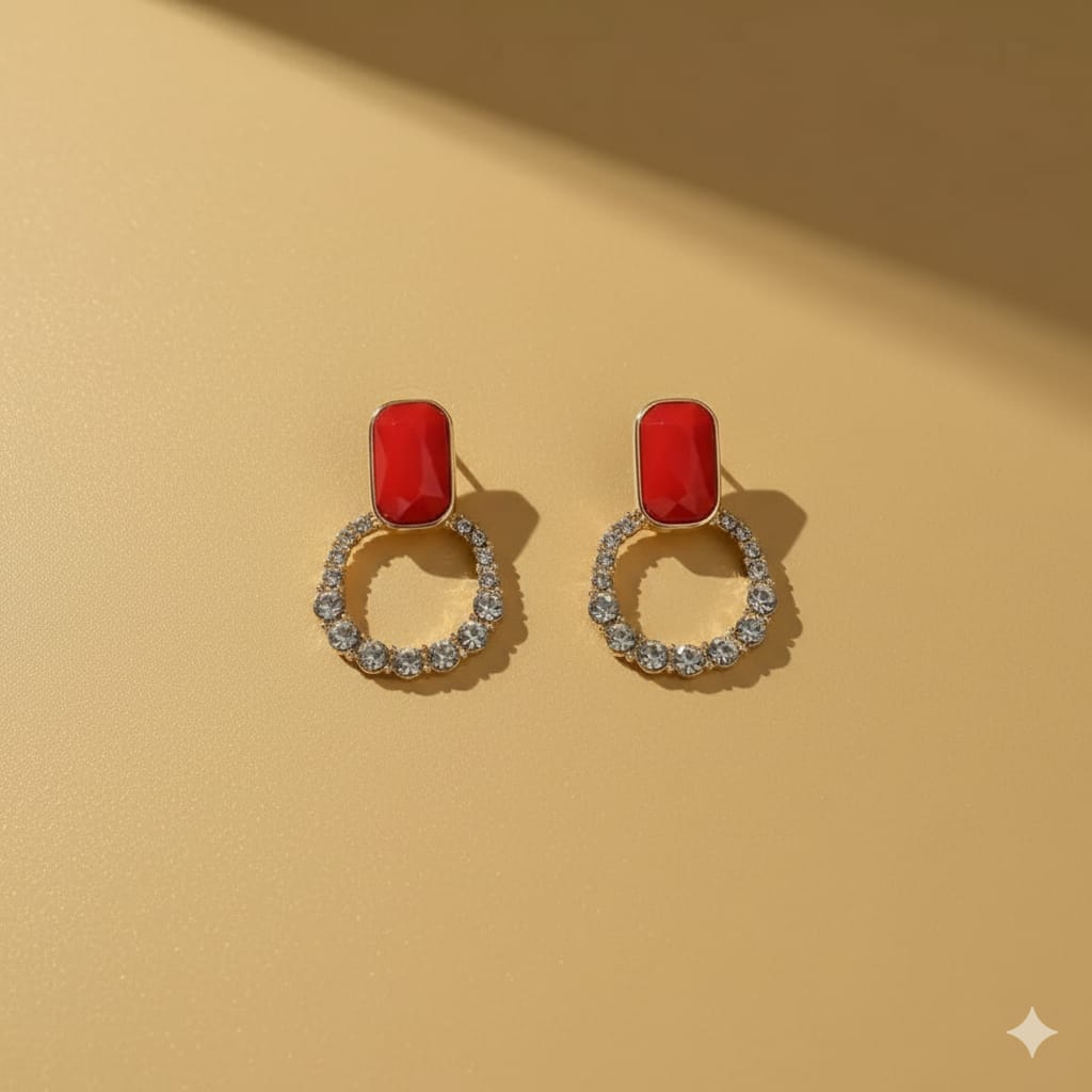 Dazzling drop earrings with a rectangular red gemstone top and a sparkling open hoop adorned with clear rhinestones, combining classic elegance with a touch of modern glam.