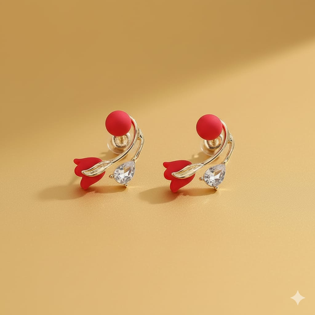 Unique ear climber style earrings with a vibrant red tulip design, accented by a sparkling teardrop-shaped crystal.
