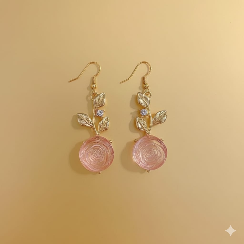 These elegant drop earrings feature a delicate golden leaf design accented with a sparkling clear gem, leading down to a charming rose-shaped dangle in a soft, translucent pink. Perfect for adding a touch of natural beauty and subtle shimmer to any outfit.