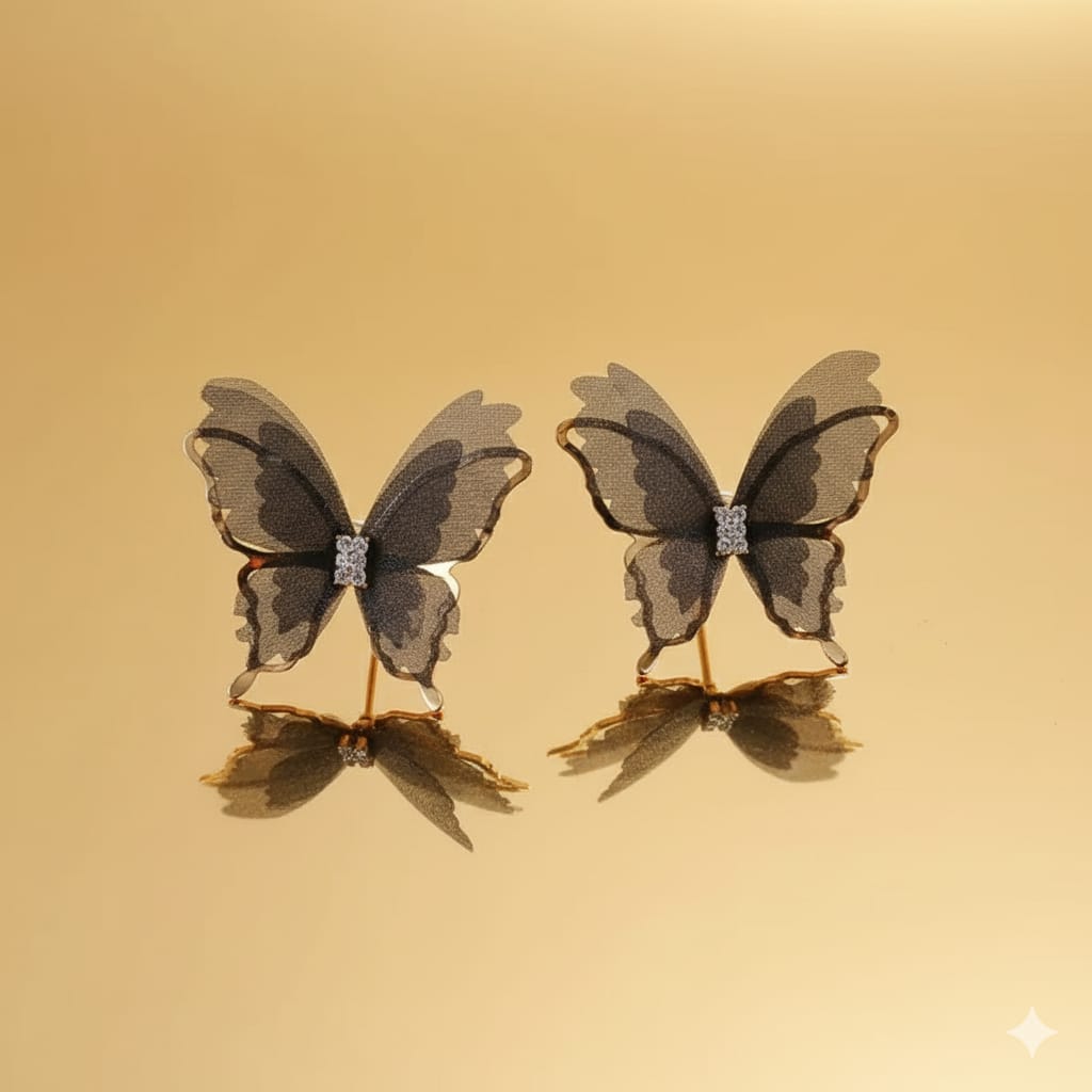 : These ethereal butterfly earrings feature delicate, sheer wings with subtle gradient shading, accented by a sparkling crystal detail at the center. Their lightweight design adds a whimsical and elegant touch.