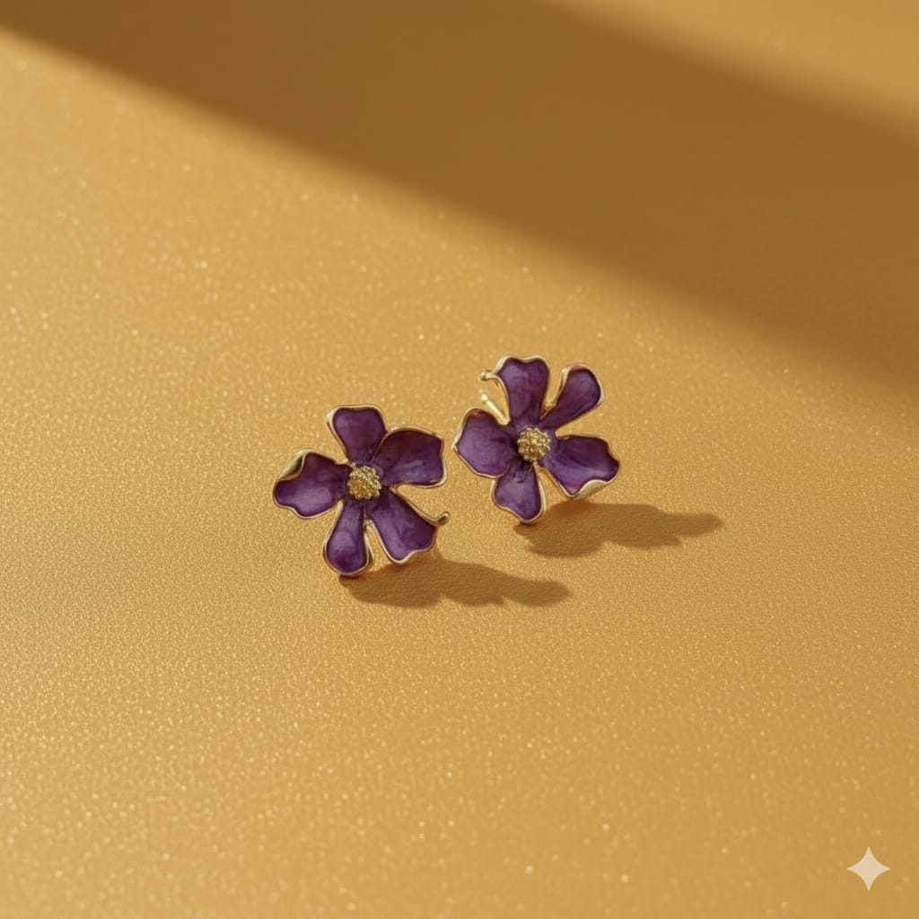 These delicate stud earrings showcase a vibrant violet-enameled flower with a small, contrasting yellow center, offering a pop of color.
