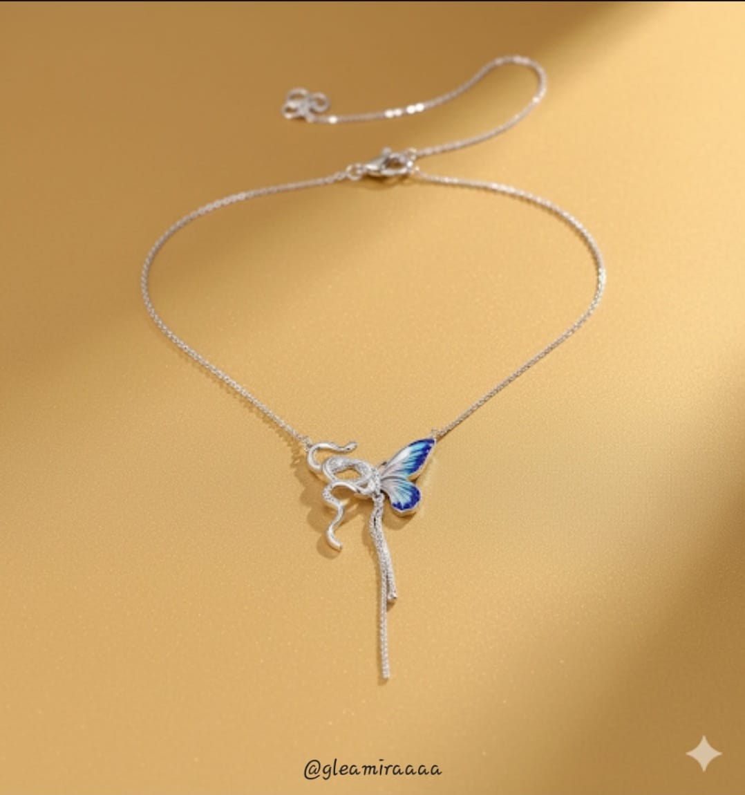 Embrace playful elegance with our Whimsical Blue Butterfly & Ribbon Necklace. This unique silver-tone piece features a beautifully detailed blue butterfly alongside a graceful, sparkling ribbon-like motif that drapes delicately. A charming and artistic accessory to add a touch of fantasy to your everyday style.