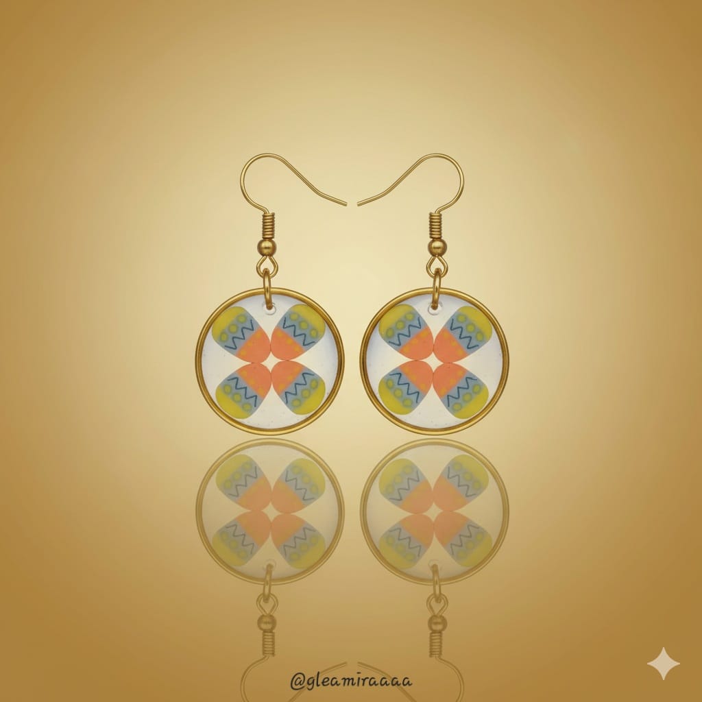 Add a playful pop of color to your day with our Whimsical Zigzag Petal Drop Earrings! These delightful circular earrings feature a charming four-petal design in cheerful shades of orange, yellow, and blue with a fun zigzag texture, all encased in clear resin and framed in a gleaming gold bezel. A unique and lighthearted accessory perfect for brightening any outfit
