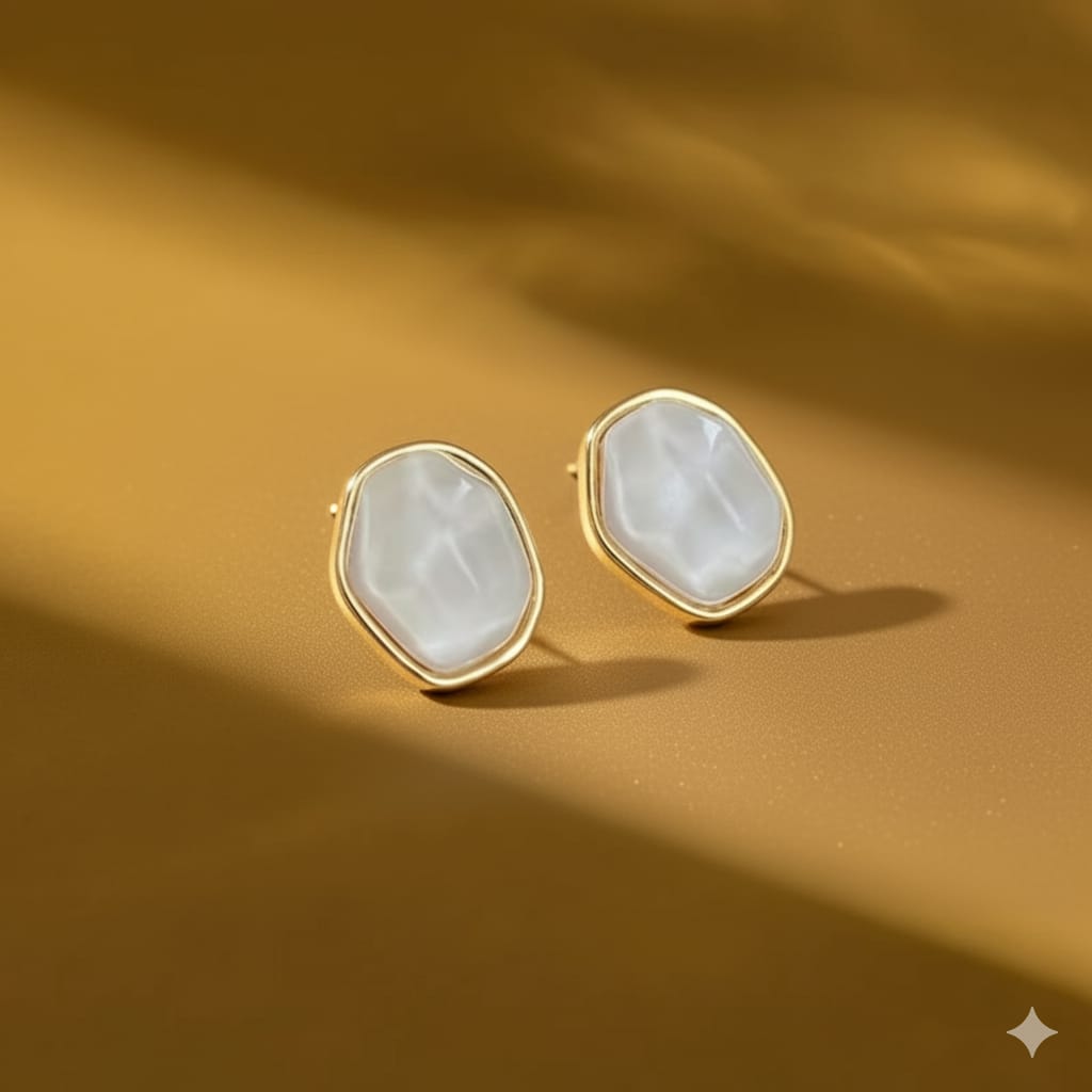 Minimalist gold-framed stud earrings featuring a smooth, irregularly shaped white stone, offering a modern and subtle elegance.